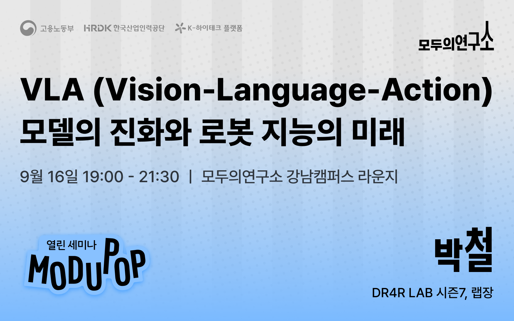 프로그램 요약: LMM → VLM → VLA의 개념적 진화부터 VLA 대표 모델과 향후 발전 방향까지. 시즌7까지 진행된 모두의연구소 장수 로봇 연구모임의 세미나에 초대합니다!