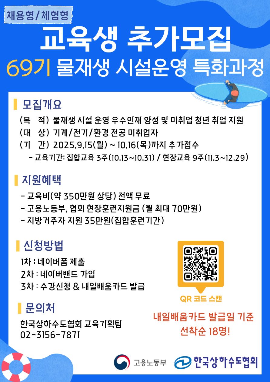 '물재생 시설운영 특화과정 모집개요' - 대 상: 기계, 전기, 환경 전공 미취업자 선착순 18명 - 모 집: 2025.10.16(목)까지 - 교 육: 이론교육(10.13~10.31) + 현장실습(11.3~12.29) ※ 현장훈련 장소: 서울물재생시설공단, 이산, 테크로스환경서비스 리뉴어스 등 - 지 원: 교육비 전액 국비지원 + 고용노동부, 협회 훈련지원금 - 신 청: 협회 홈페이지 공지사항 참고 후 온라인 신청서 제출