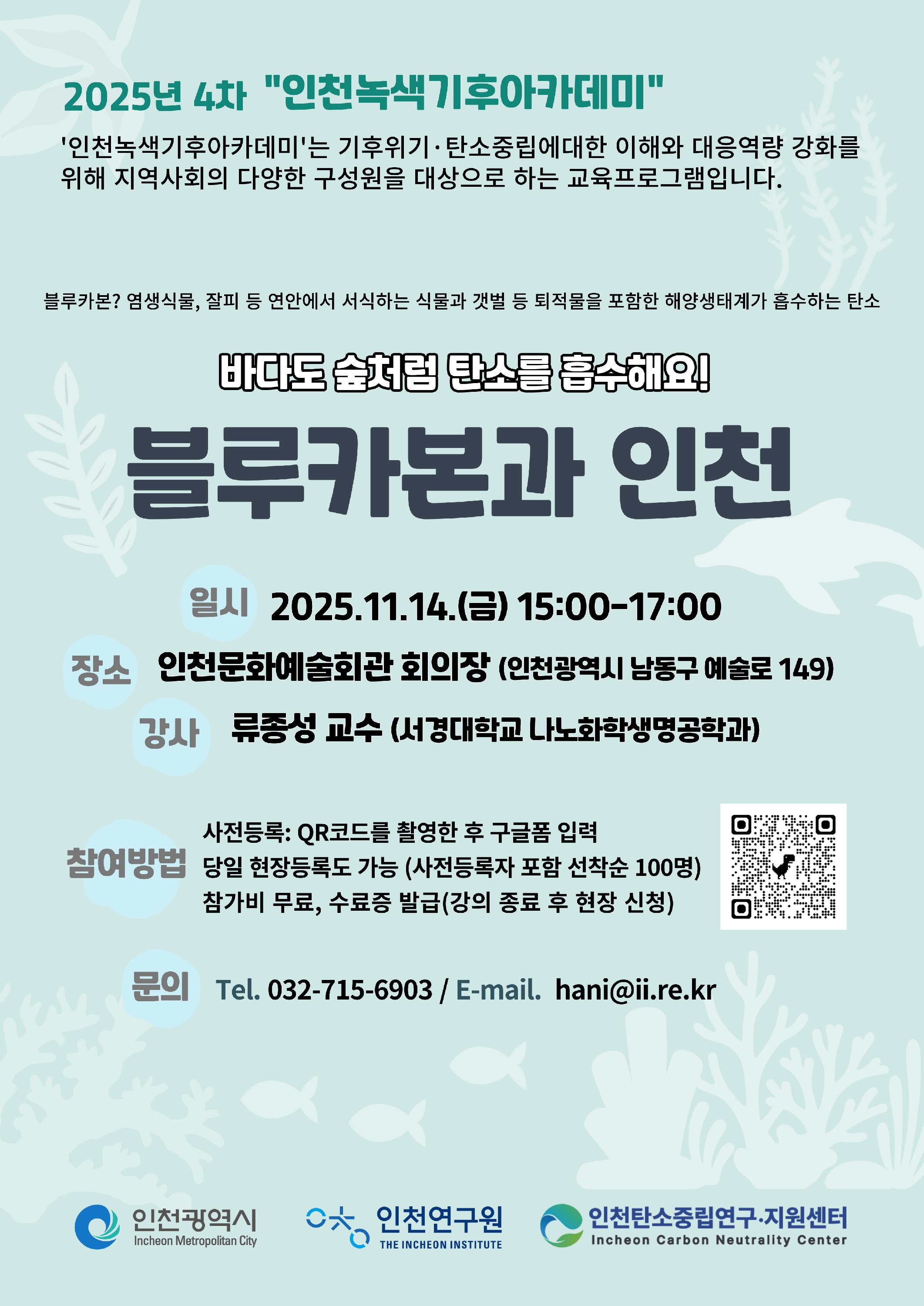 ⭐교육 개요 ◼ 일시: 2025년 11월 14일(금) 15:00-17:00 ◼ 장소: 인천문화예술회관 회의장 (인천 남동구 예술로 149) ◼ 주제: 블루카본과 인천-온실가스 감축에서 기후적응 수단으로 ◼ 강사: 류종성 교수 (서경대학교 나노화학생명공학과) ◼ 주최 및 주관: 인천연구원 인천탄소중립연구·지원센터