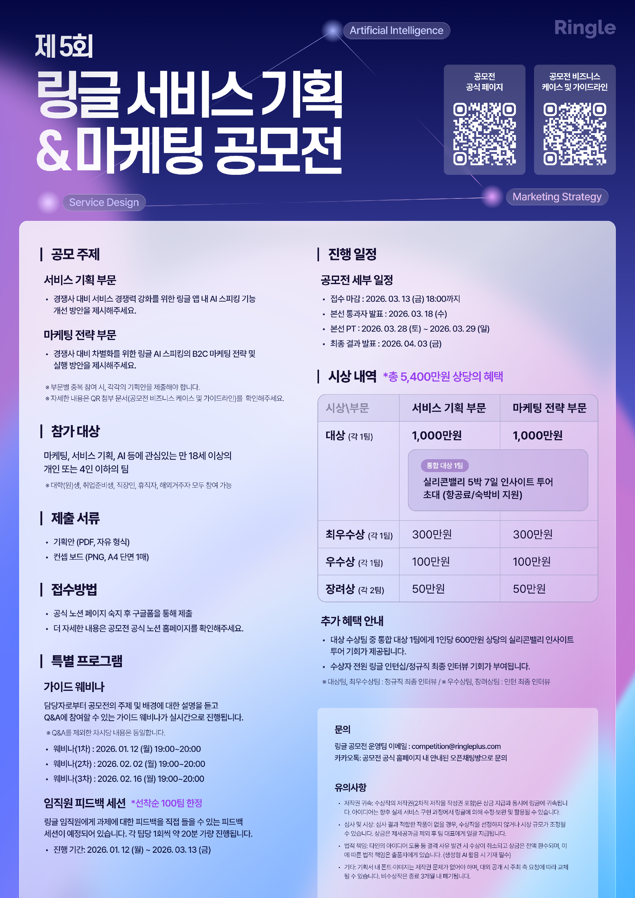■ 공모 주제 [서비스 기획 부문] 서비스 경쟁력 강화를 위한 링글 앱 내 AI 스피킹(AI 튜터·AI 전화영어) 기능 개선·고도화 [마케팅 전략 부문] 차별화를 위한 링글 AI 스피킹(AI 튜터·AI 전화영어)의 B2C 마케팅 차별화 전략 및 구체적인 실행방안 ※ 부문 간 중복 참여 가능합니다. ■ 지원 자격 마케팅과 서비스 기획 혹은 AI 등에 관심있는 만 18세 이상의 개인 또는 4인 이하의 팀 ■ 진행 일정 - 접수 마감 : 26. 03.13 (금) 18:00까지 - 본선 통과자 발표 : 26. 03. 18 (수) - 본선 PT : 26. 03. 28 (토) ~ 26. 03. 29 (일) - 최종 결과 발표 : 26. 04. 03 (금) ■ 특별 프로그램 참가자분들께 더 많은 정보를 제공해드리기 위한 링글 공모전만의 2가지 특별 프로그램이 예정되어 있습니다.