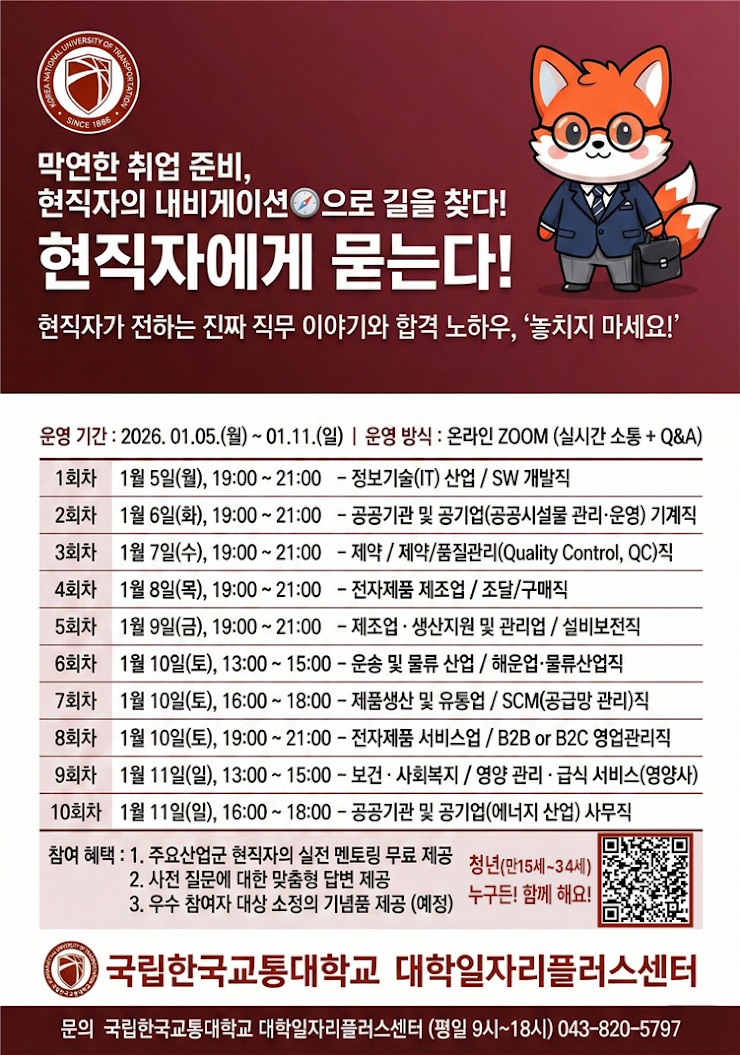 국립한국교통대학교 대학일자리플러스센터에서는 우리 학교 재학생과 충청북도 지역 청년들의 성공적인 취업을 지원하기 위해 <주 산업군 현직자 릴레이 직무설명회>를 실시합니다.