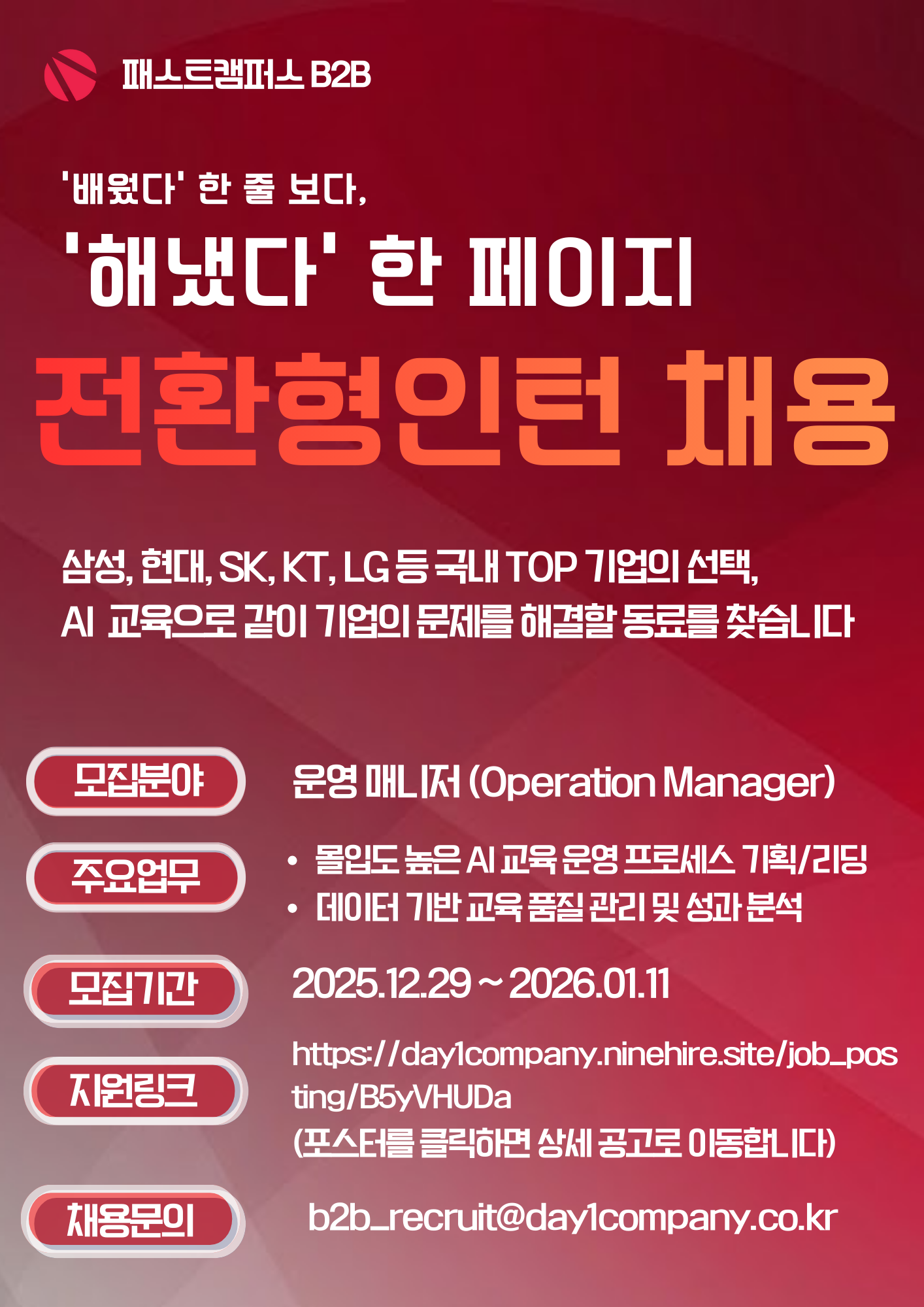 | 제목 | [패스트캠퍼스 B2B] 채용연계형 인턴 채용 공고 | 마감일시 | 2026-01-11 | 조회수 | 107 |