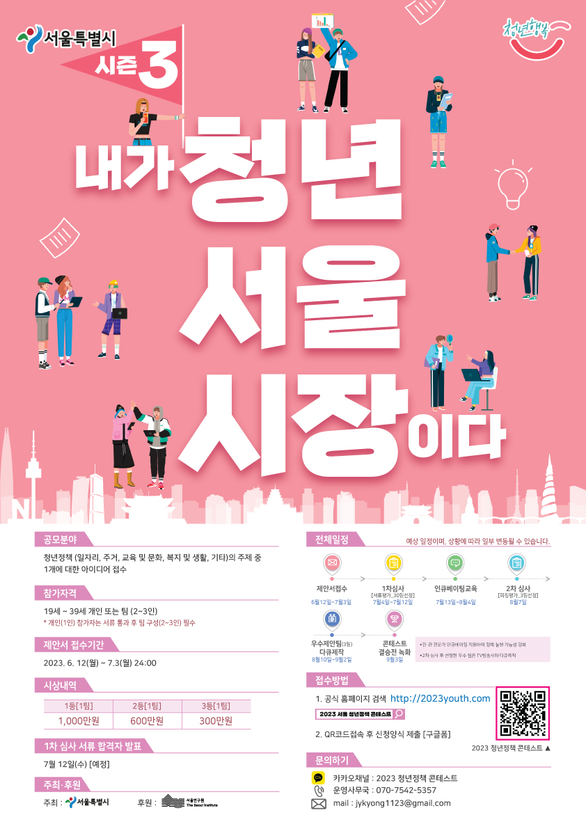 ■ 행사 개요 1. 대 회 명 : ‘내가 청년 서울시장이다. 시즌3’ 2. 대회기간 : 2023. 6. 12. ~ 2023. 9. 3. 3. 참가자격 : 만 19세~39세 개인 또는 팀(2~3인) ※ 개인(1인) 참가자는 서류 통과 후 팀구성(2~3인) 필수 4. 제안분야 : (4개 분야)일자리, 주거, 교육·문화, 복지·생활·기타 5. 제안내용 : 정책 제안 및 제안의 배경이 된 사연(경험) 제출 6. 연구과제비 및 시상금 - 연구과제비 : PT 30개팀, 결승진출 3팀 각 50만원 - 시 상 금 : 1등 1,000만원, 2등 600만원, 3등 300만원