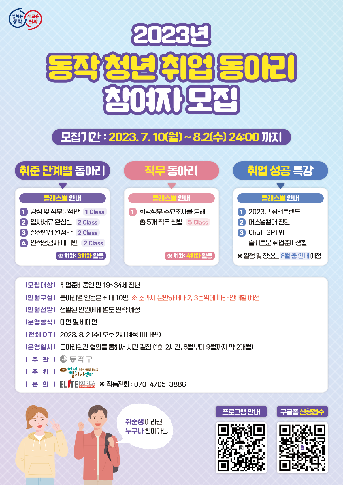동작구는 [2023년 동작 청년 취업동아리] 사업을 개시하여 연령대와 취업준비도, 선호 직무 등 비슷한 정체성을 가진 청년을 대상으로 집중교육 및 네트워킹을 지원하여 취업에 성공할 수 있도록 다음과 같이 참여자를 모집하오니, 취업 활동에 관심있는 청년들이 참여할 수 있도록 많은 관심 부탁드립니다 .