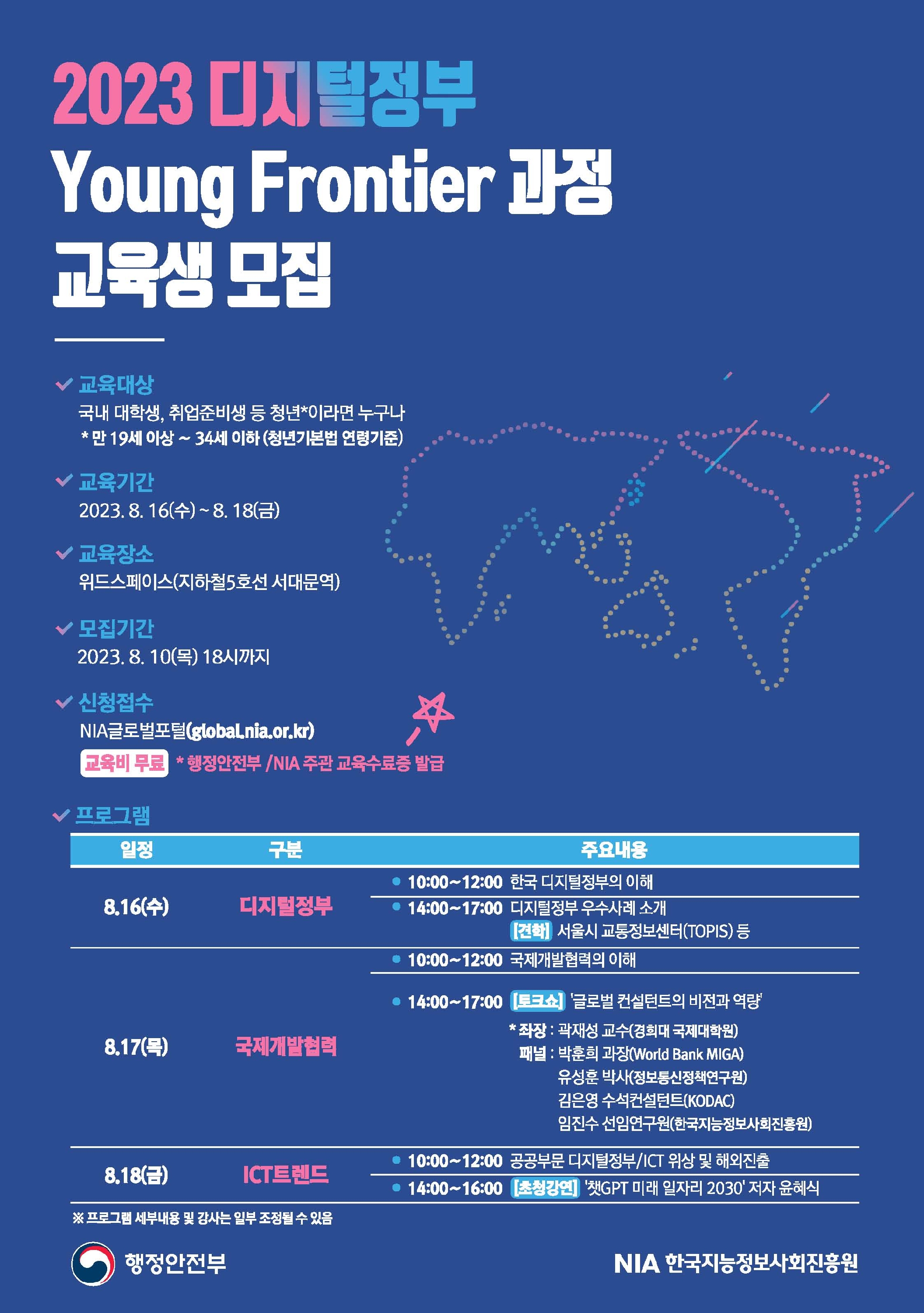 - 과정명: 2023년 디지털정부 Young Frontier 과정 - 일정 및 장소: 2023. 8. 16.(수)~18(금) [3일간], 위드스페이스[서울 서대문역] - 교육대상: 대학생, 대학원생, 취업준비생, 사회초년생 등 청년 (30명 내외) - 교육내용: 디지털정부·ICT·국제개발협력 분양의 강의, 현장견학, 토크쇼, 챗GPT 실습 등 - 교육비: 무료 - 주최/주관: 행정안전부/한국지능정보사회진흥원 - 모집기간: ~2023. 8.10(목), 18:00 까지 - 지원방법: NIA 글로벌 포털 홈페이지 접수(global.nia.or.kr)