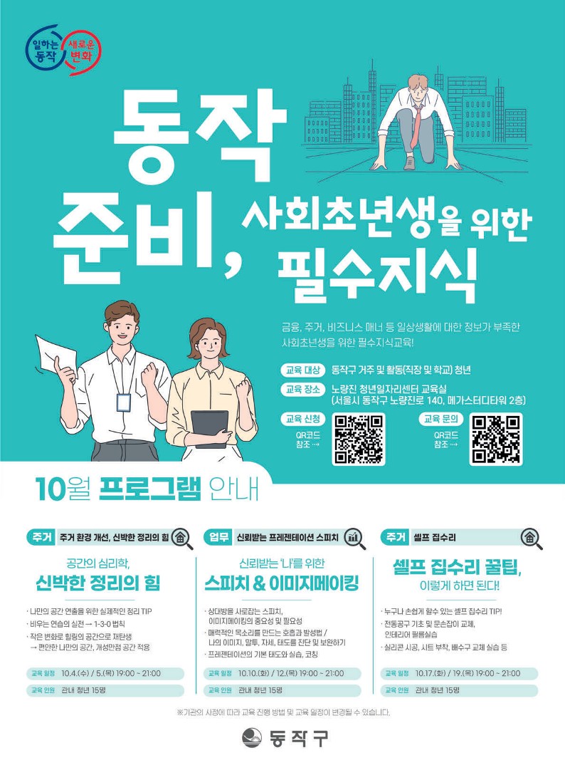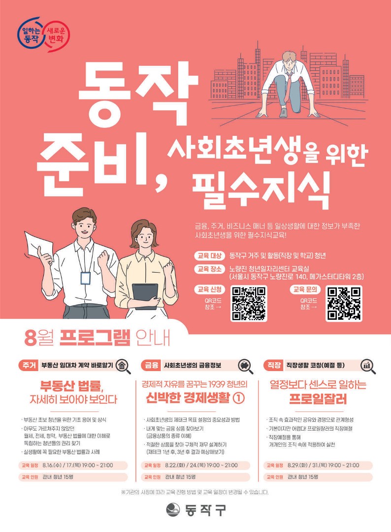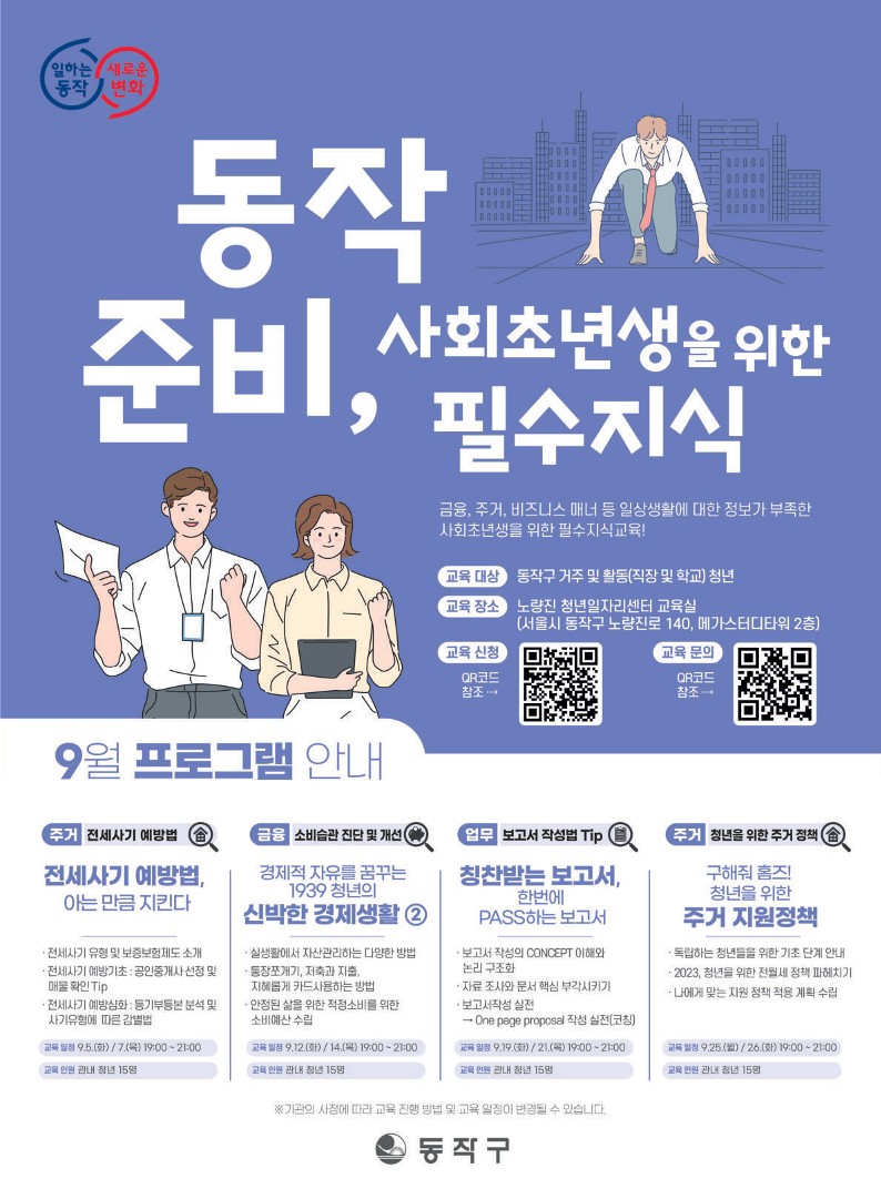 동작구는 [동작 준비, 사회초년생을 위한 필수지식] 사업을 개시하여 금융, 주거, 비즈니스 매너 등 일상생활에 대한 정보가 부족한 사회초년생을 위한 필수지식을 교육하오니, 많은 관심과 참여 부탁드립니다.