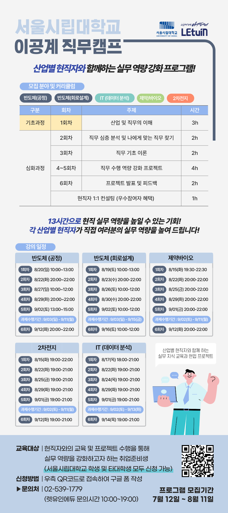 강의 시기(직무별 상이) : 8/14일 ~ 9/24일 선발 인원 - 기초과정 : 50명 (직무별) - 심화과정 : 10명 (직무별) 신청대상 [필독] 만 34세 이하 청년 중 아래 대상자만 신청 가능합니다. - 서울시립대학교 학생 및 타대학교 학생 - 서울&경기 지역 거주자 또는 서울&경기 지역 대학교 재학생(졸업생), 특성화고 재학생(졸업생), 졸업생은취준생에 한함 심화 수강 대상자 별도 안내 예정 교육방식 : ZOOM Live
