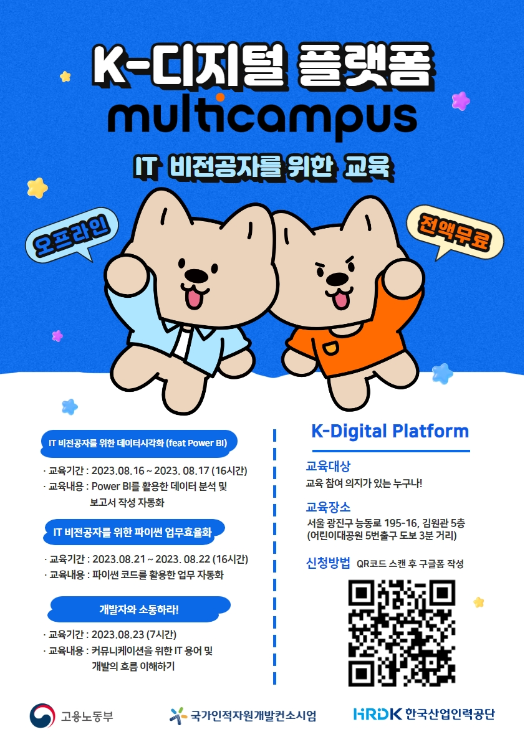 ▼ 아래 과정 중 선택(중복 신청 및 수강 가능) ① IT 비전공자를 위한 데이터시각화(feat Power BI) - 2023.08.16~2023.08.17 - 09:00~18:00(16시간) - 과정 상세보기: https://vo.la/tpVwZ
