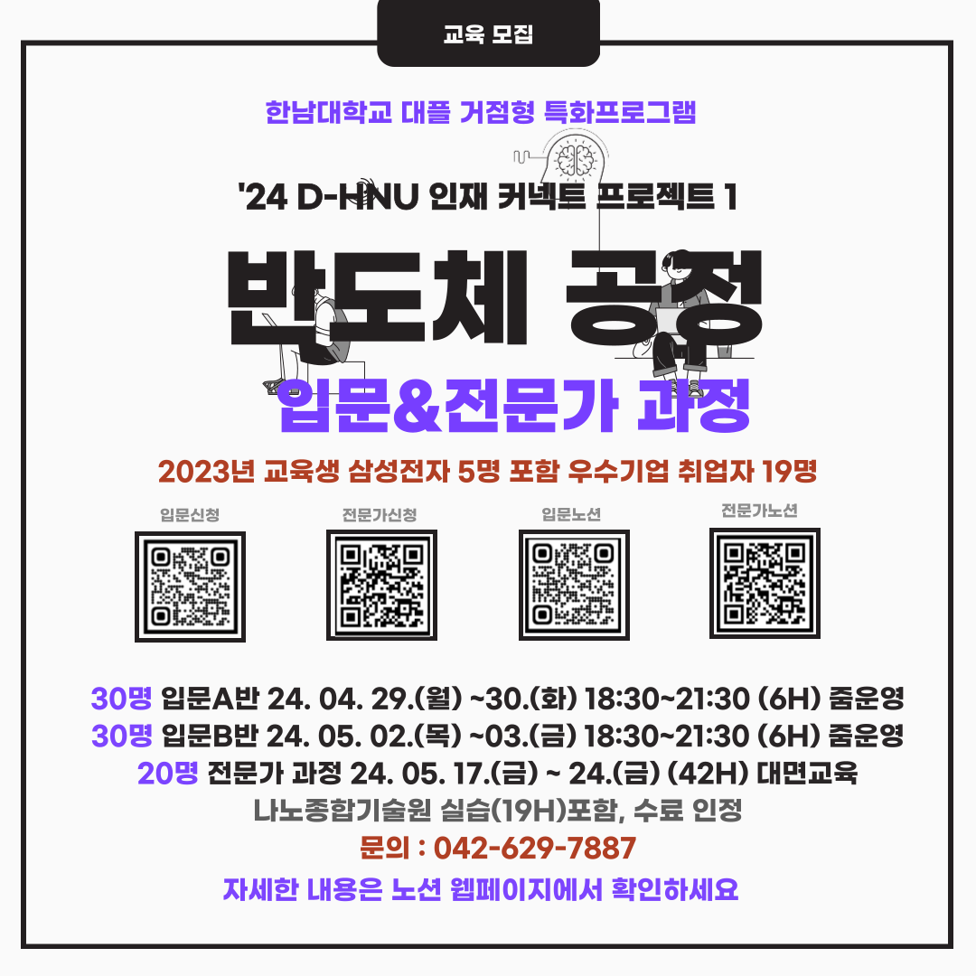가. 프로그램 : 거점형 특화프로그램 '24 D-HNU 인재 커넥트 프로젝트 1 「반도체 공정 입문 및 전문가 과정」 나. 모집기간 1) 반도체 공정 입문 과정 A반, B반 : 2024. 04. 11.(목) ~ 24.(수) 2) 반도체 공정 전문가 과정 : 2024. 04. 15.(월) ~ 05. 07. (화) ※ 선발과정(서류전형, 면접선발/ 입문(유선), 전문가(대면 또는 온라인 면접)) ※ 선발기준 : 소속, 전공적합성, 지원동기, 교육 후 계획, 기타(어학, 자격, 학점) 다. 운영대상 : 지역청년 (반도체관련 전공 취업준비생, 4학년 이상, 졸업생) 라. 교육혜택 : 무료교육, 수료증 발급(80% 이상 참여자)_전문가 과정 나노종합기술원 수료증 포함 마. 운영일자 1) 반도체 공정 입문 과정 A반(온라인) : 2024. 04. 29.(월) ~ 30.(화) 18:30 ~ 21:30, 6시간 2) 반도체 공정 입문 과정 B반(온라인) : 2024. 05. 02.(목) ~ 03.(금) 18:30 ~ 21:30, 6시간 3) 반도체 공정 전문가 과정(오프라인) : 2024. 05. 17.(금) ~ 05. 24.(금) 8일, 42시간 바. 운영장소 : 한남대학교 인사례교양동 1층 취창업훈련실 A, 나노종합기술원 교육원 및 팹실습실 사. 교육신청(네이버 폼) 1) 반도체 공정 입문 과정 A반, B반 : https://naver.me/FVBMfh7G 2) 반도체 공정 전문가 과정(4월15일부터): https://naver.me/5XTsGwiE 아. 비고 : 자세한 내용은 첨부 파일 참조 자. 담당자 : 한남대학교 대학일자리플러스센터 주선미(042-629-7887) dreamjob12@hnu.kr ![]() |