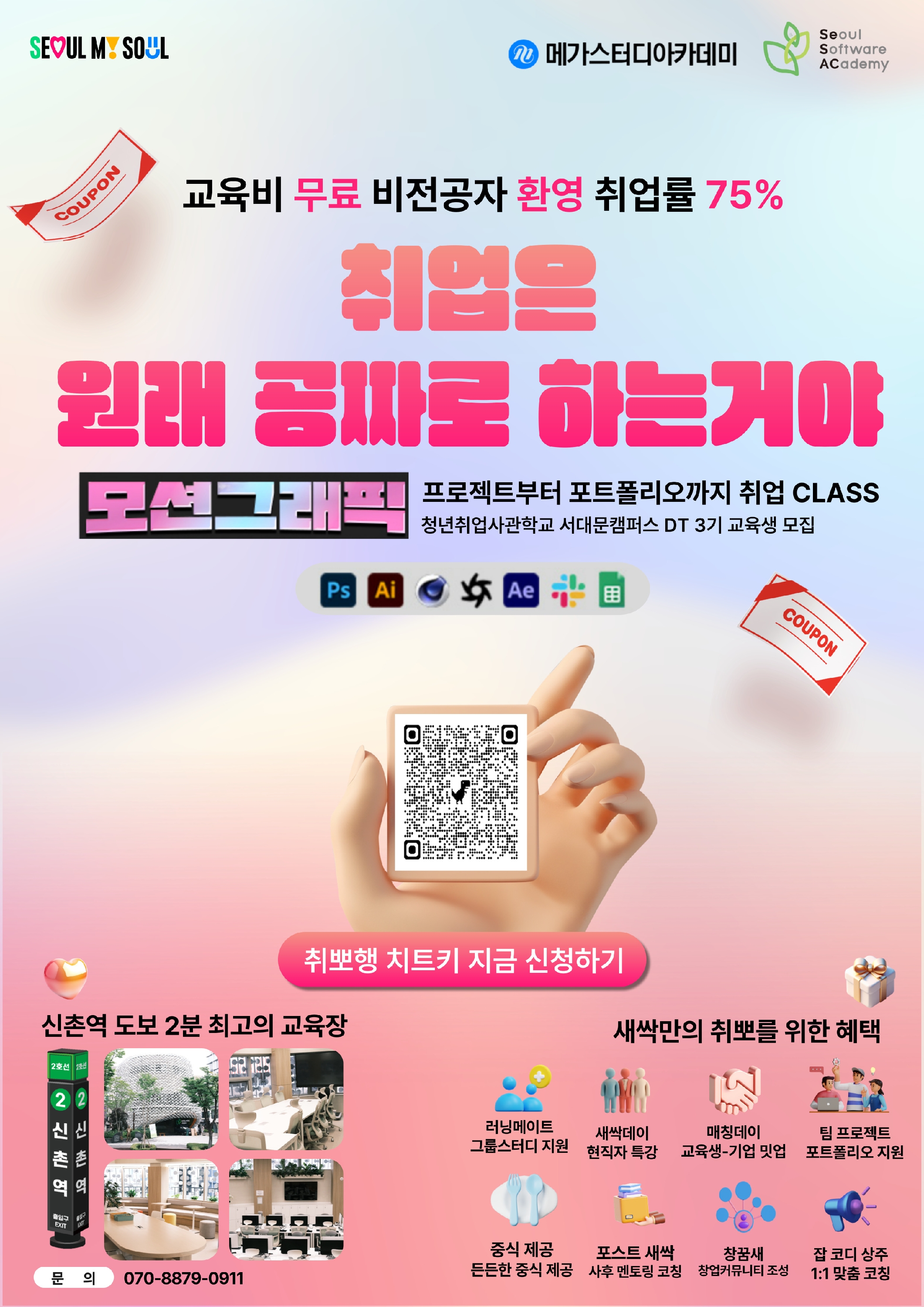 서울특별시와 서울경제진흥원(SBA)은 디지털 경제로의 전환과 급속도로 수요가 증가되고 있는 디지털 전문인력의 양성과 일자리 연계를 위해 새싹 서대문캠퍼스 DT3기 교육생을 모집 하오니 많은 참여 있으시길 바랍니다.