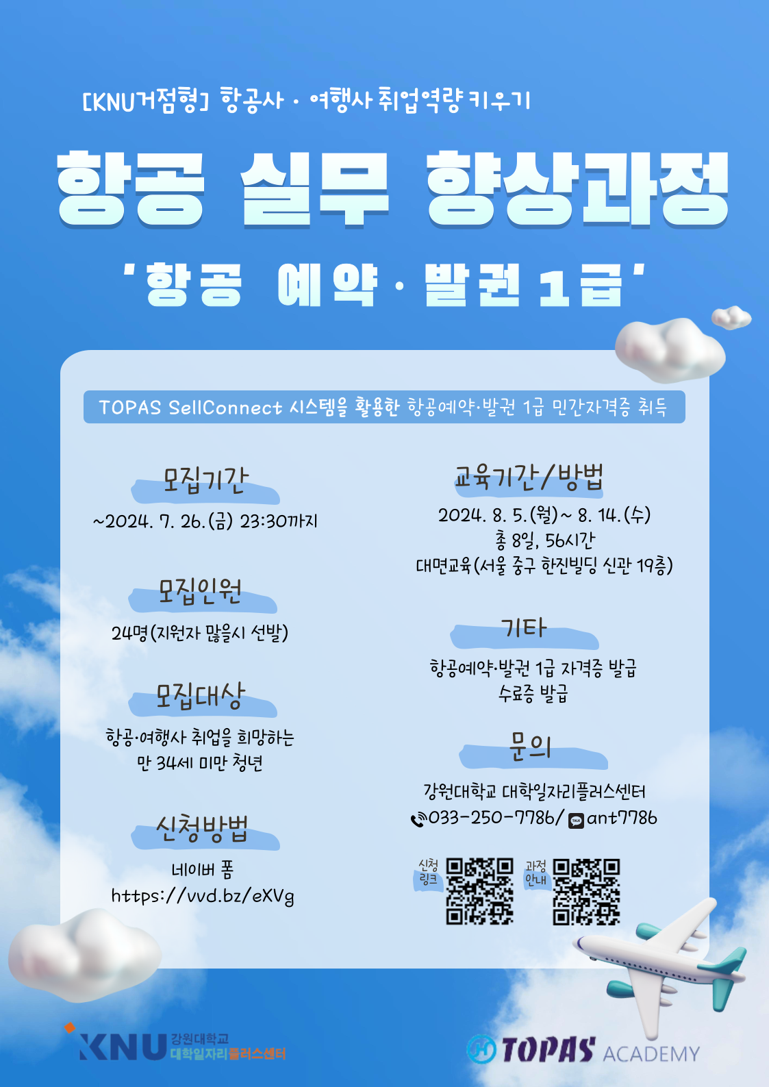 가. 사 업 명: [거점형] 2024 하계 항공실무(항공예약·발권) 향상과정 나. 교육기간: 2024. 8. 5.(월) ~ 8. 14.(수)/총 8일/56시간 다. 모집기간: ~2024. 7. 26.(금) 23:30까지/선발자 발표 8.1.(목) 16시 이후 라. 교육대상: 항공·여행산업 취업을 희망하는 만 34세 미만 청년 누구나 마. 교육방법: 대면(서울 중구 소공로 88, 한진빌딩 신관 19층) 바. 교육내용: TOPAS SellConnect 시스템을 활용한 항공예약, 예약운임발권, 여행사 실무 등 사. 신청방법: 네이버 폼(https://naver.me/FtTfoXKc) ※과정 안내 링크 https://naver.me/54L0mZJz 아. 문 의: 강원대학교 대학일자리플러스센터 조숙현(☎033-250-7786)
