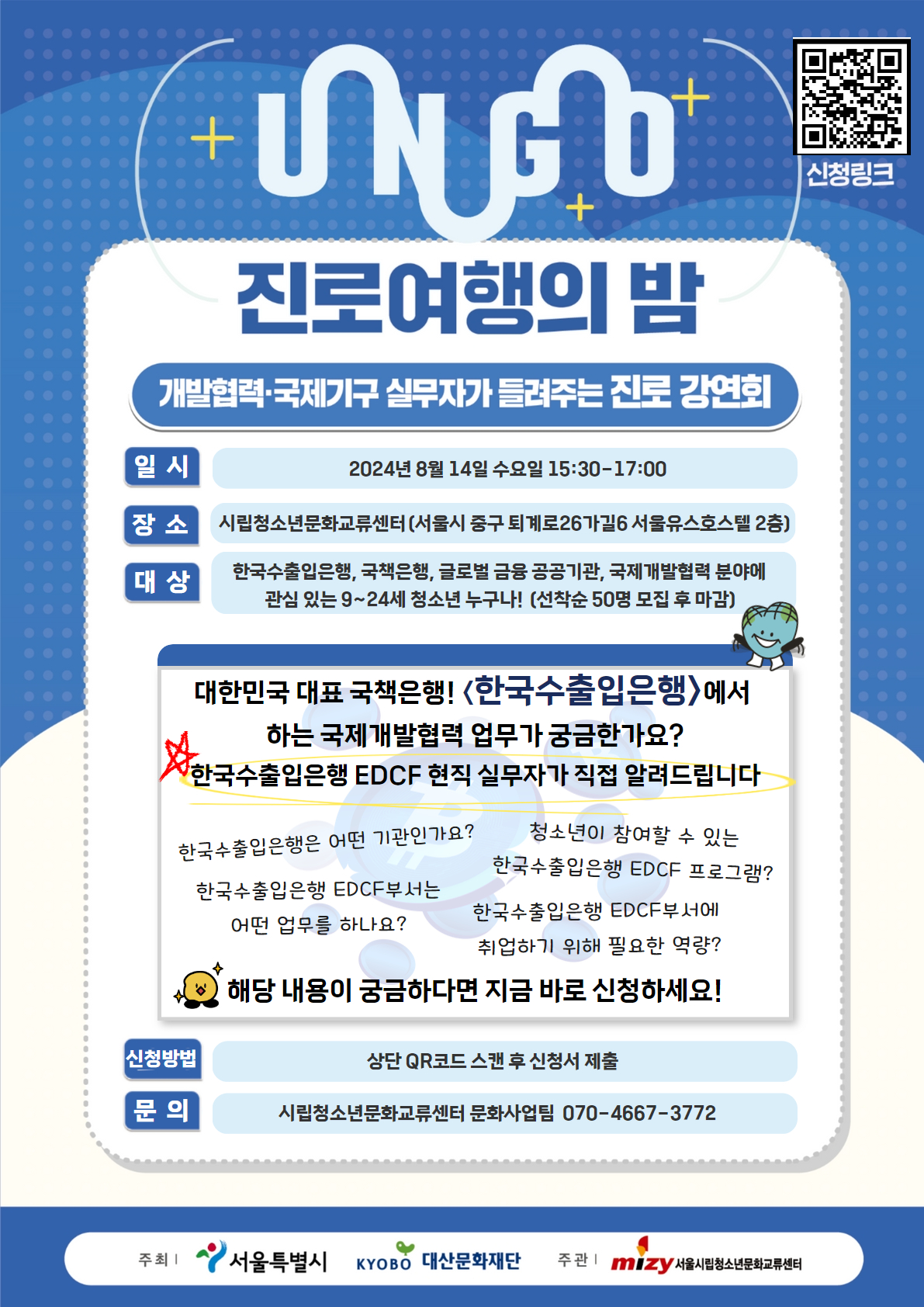 가. 사 업 명 : UNGO 진로여행의 밤 나. 대 상 : 9~24세 청소년 누구나 다. 일 정 : 2024년 8월 14일(수) 15:30-17:00 라. 장 소 : 시립청소년문화교류센터 나눔방(서울특별시 중구 퇴계로26가길 6, 2층) 마. 주요내용 : 한국수출입은행 EDCF 부서 실무자 진로 강연회 바. 협조사항 : 진로 관련 부서, 외부 프로그램 홍보 등 웹포스터 온/오프라인 게시 사. 문 의 : 문화사업팀 김양희 ☎ 070-4667-3772 / yhnara90@mizy.net |