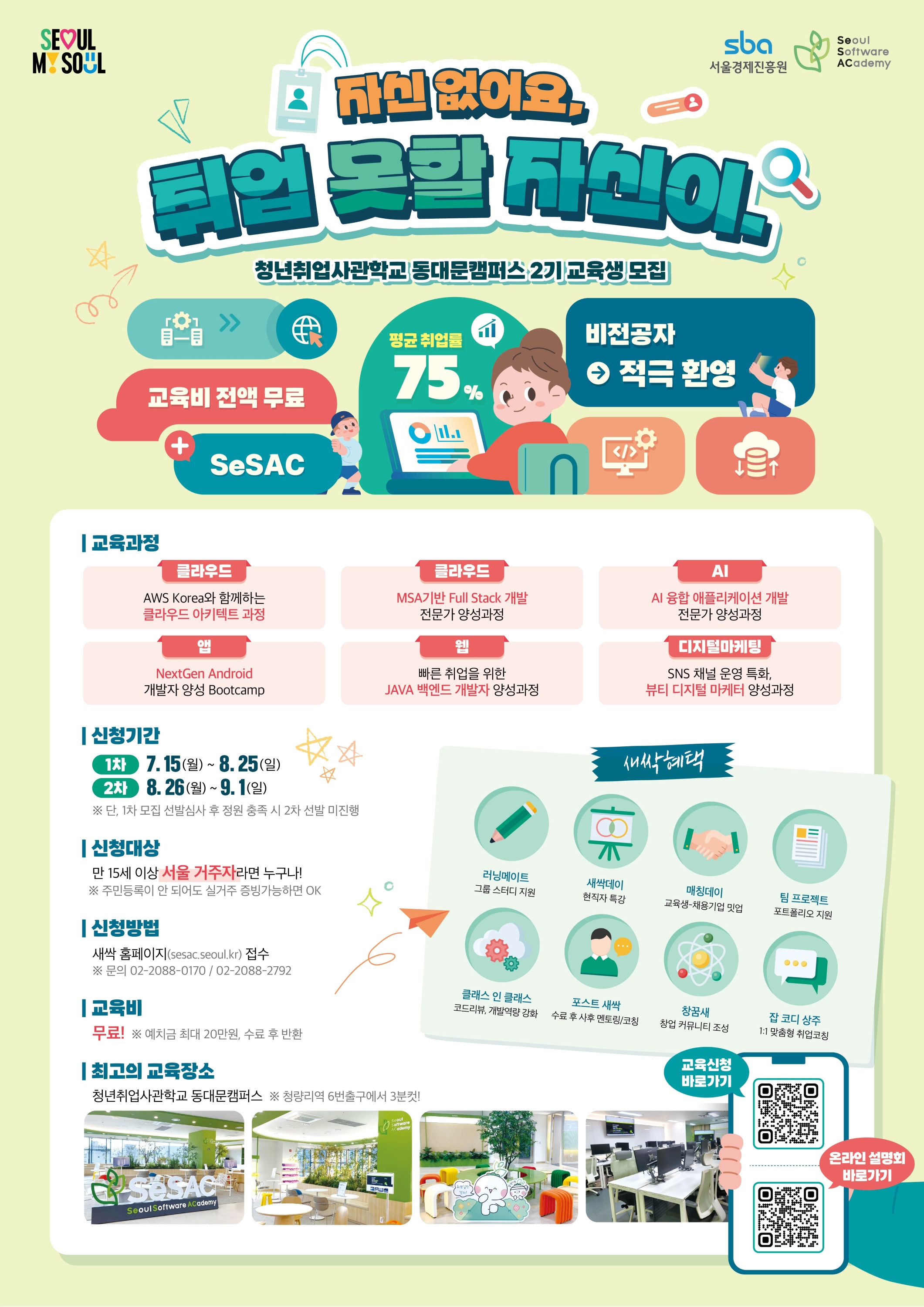 서울특별시와 서울경제진흥원(SBA)은 디지털 경제로의 전환과 급속도로 수요가 증가하고 있는 디지털 전문인력의 양성과 일자리 연계를 위해 새싹 동대문캠퍼스 2기 교육생을 모집하오니 많은 참여 있으시길 바랍니다.