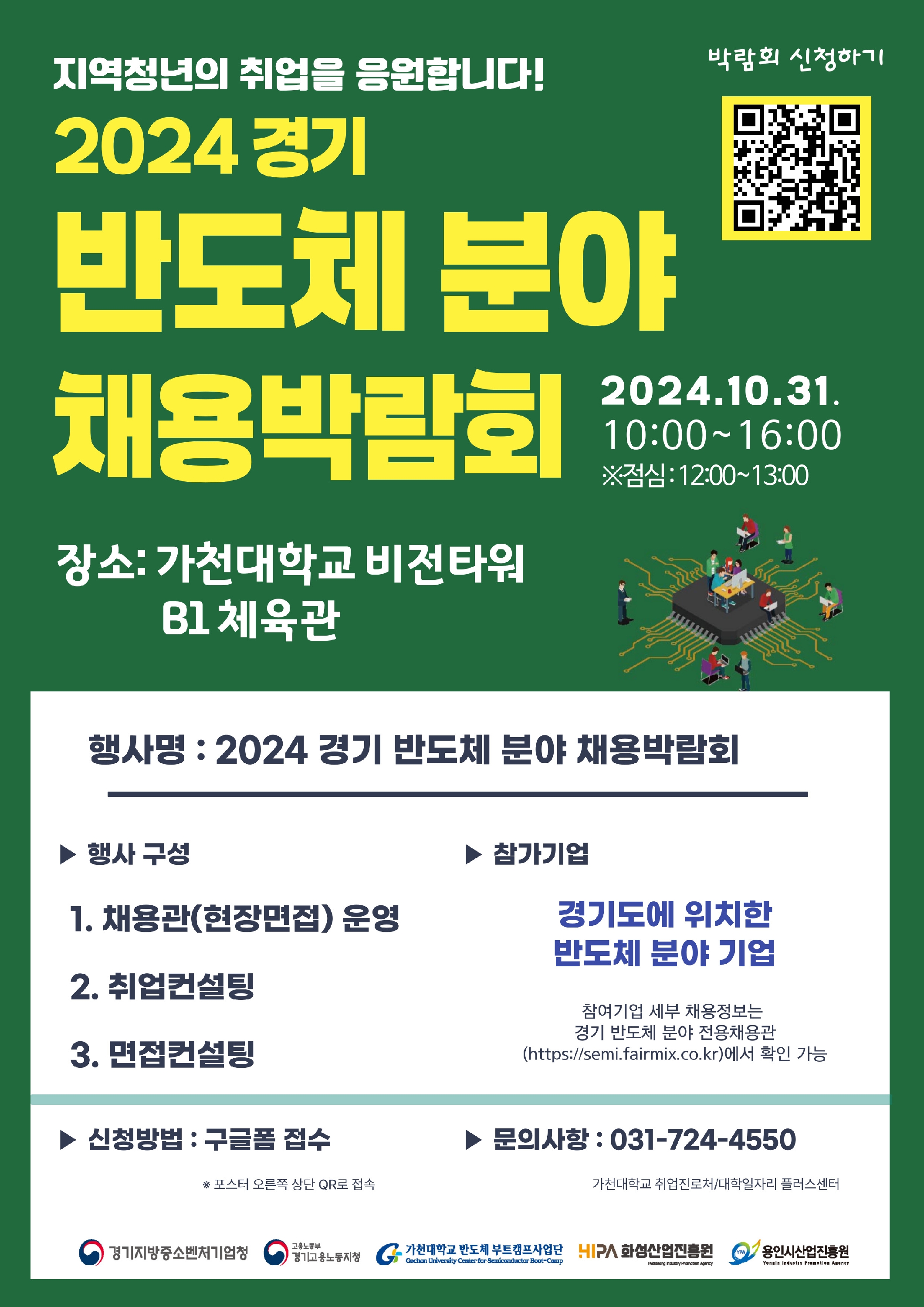 가. 행 사 명 : 「2024 경기 반도체 분야 채용박람회」 나. 참여대상 :재학생·졸업생 및 지역청년 다. 세부내용 1) 일 시 : (현장 채용박람회) 24.10.31.(목) 10:00 ~ 16:00 ※점심시간: 12:00~13:00 (온라인 전용 채용관) 24.11.04.(월) ~ 12.30.(월) 2) 장 소 : 가천대학교 글로벌 캠퍼스 비전타워 B1 실내 체육관 3) 행사구성 : 참가기업과의 현장면접, 취업서류 컨설팅, 면접 컨설팅 등 부대행사 4) 참가대상 : 현장참가 44개사 ※ 참여기업 세부 채용정보는 경기 반도체 분야 전용채용관(https://semi.fairmix.co.kr/)에서 확인 가능 라. 신청방법 :홍보포스터 내 QR코드 스캔 후 구글폼 작성 (바로가기:https://buly.kr/APtkexj) ※ 참여 신청자 대상 특강 접속 주소 문자 발송 예정 ![]() |