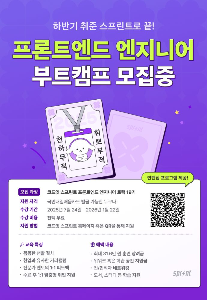[코드잇 스프린트] 프론트엔드 부트캠프 19기 모집 중�부트캠프 만족도 1위 �소비자 평가 부트캠프 1위 �프론트엔드 부트캠프 수강생 수 1위