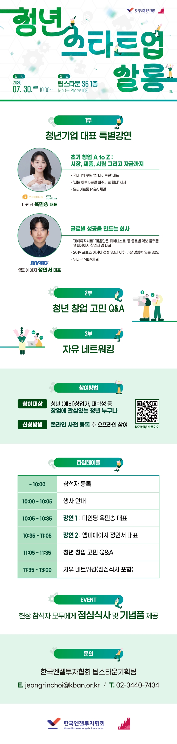 ㅇ 행사문의: 한국엔젤투자협회 팁스타운기획팀(02-3440-7434 / jeongrinchoi@kban.or.kr)