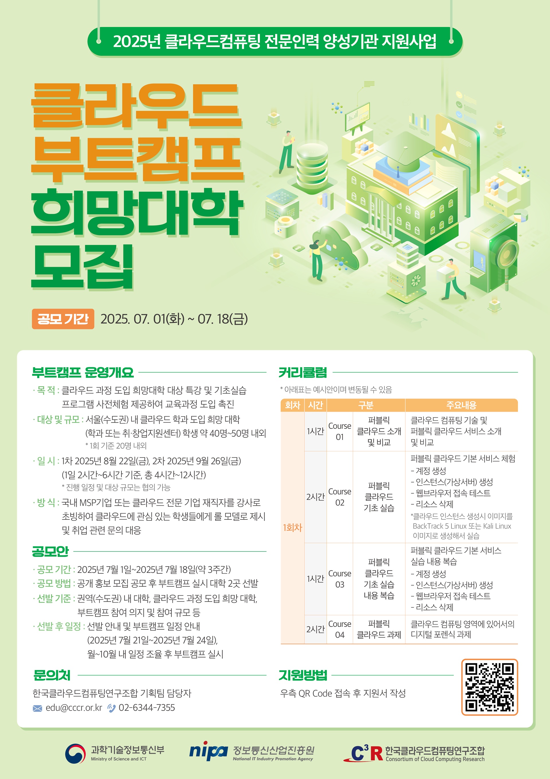 가. 모집 개요 o 사 업 명 : 클라우드컴퓨팅 전문인력 양성기관 지원사업 o 주관기관 : 한국클라우드컴퓨팅연구조합 o 목 적 : 클라우드 과정 도입 희망대학 대상 특강 및 기초실습 프로그램 사전 체험 제공하여 교육과정 도입 촉진 o 대 상 : 권역 내 클라우드 학과 도입을 희망 대학(학과 및 취·창업지원센터) 학생 약 40명~50명 내외 o 일 시 : 1차 2025년 8월 22일, 2차 2025년 9월 26일(1일 6시간, 총 12시간) * 실제 진행 일정 및 대상 규모는 내부사정에 의해 변동될 수 있음 o 방 식 : 국내 MSP기업 또는 클라우드 전문 기업 재직자를 강사로 초빙하여 클라우드에 관심 있는 학생들에게 롤 모델로 제시 및 취업 관련 문의 대응 가능케 함 나. 공모안 o 공모 기간 : 2025년 7월 1일 ~ 2025년 7월 18일(약 3주간) o 공모 방법 : 공개 홍보 모집 공모 후 부트캠프 실시 대학(학과 및 취·창업지원센터) 2곳 선발 o 선발 기준 : 권역 내 대학, 클라우드 과정 도입 희망 대학(학과 및 취·창업지원센터), 부트캠프 참여 의지 및 참여 규모 등 o 선발 후 일정 - 7월 21일 ~ 7월 24일 : 부트캠프 실시 대학(학과 및 취·창업지원센터) 2곳 선발 및 부트캠프 일정 안내 - 7월 ~ 10월 내 : 일정 조율 후 부트캠프 2회 실시 다. 접수 방법 o 접수 방법 : 첨부된 홍보물 내 QR 코드