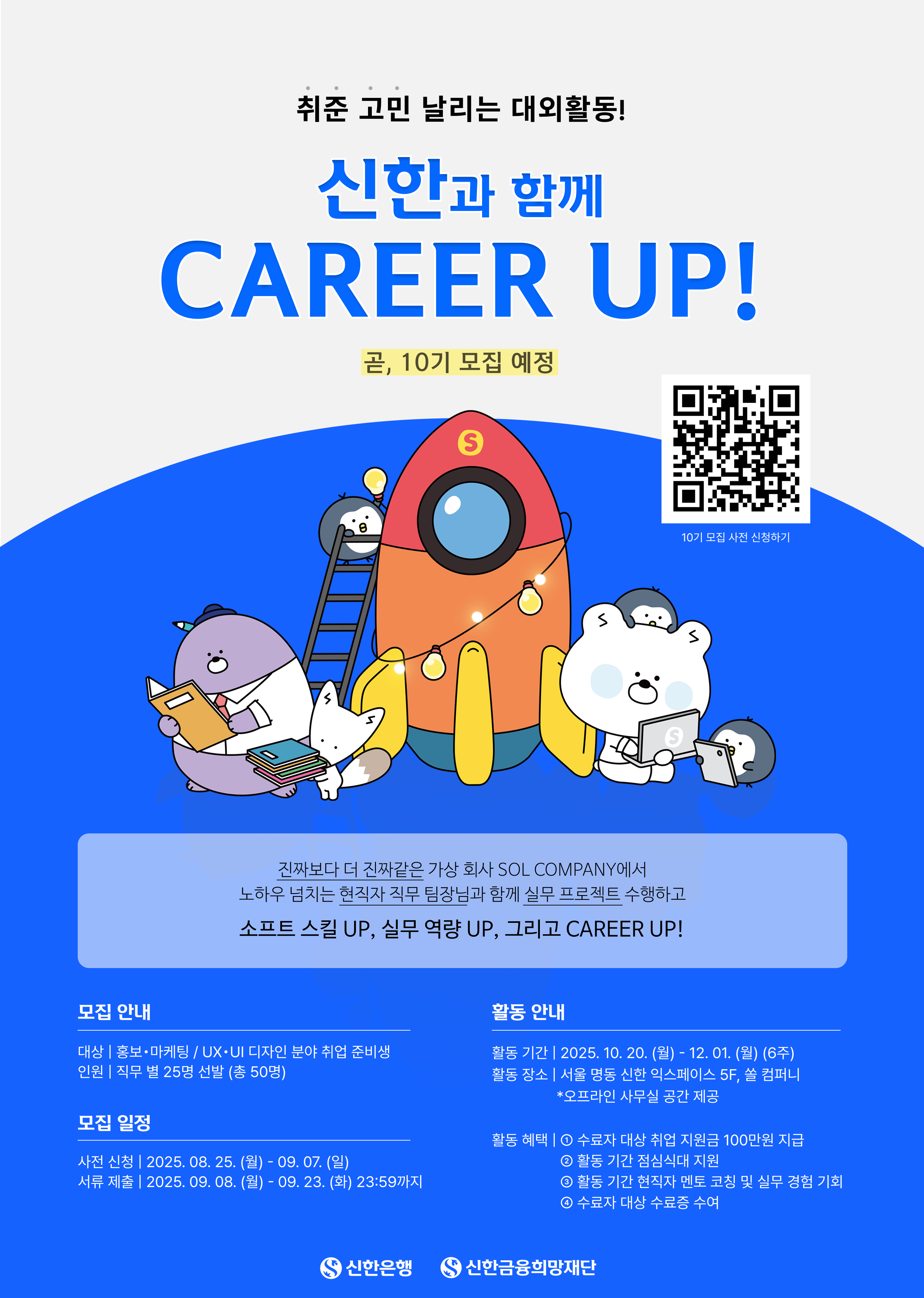 | 제목 | [직무체험] [신한은행/신한금융희망재단] 취업 지원 대외활동 '신한 커리어업' 10기 | 마감일시 | 2025-09-23 | 조회수 | 203 | |