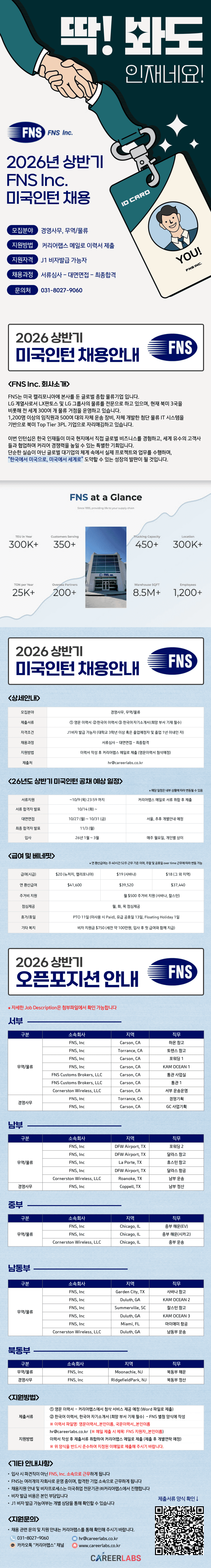 ■ 이메일 문의: hr@careerlabs.co.kr ■ 입사 절차 및 비자 상담 신청: https://www.careerlabs.co.kr/25/?q=YToxOntzOjEyOiJrZXl3b3JkX3R5cGUiO3M6MzoiYWxsIjt9&bmode=view&idx=167669241&t=board