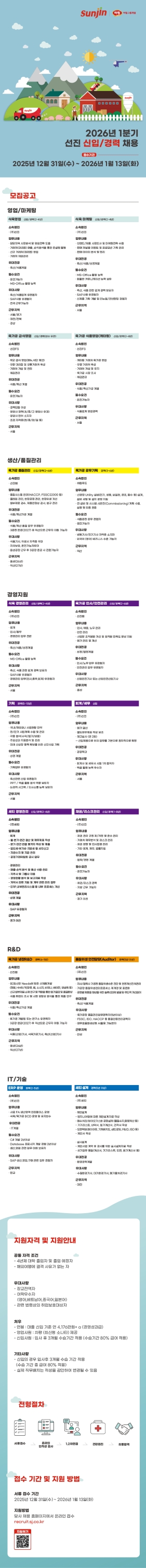[정규직] [하림그룹 (주)선진] 2026년 1분기 선진 신입 · 경력 채용 모집