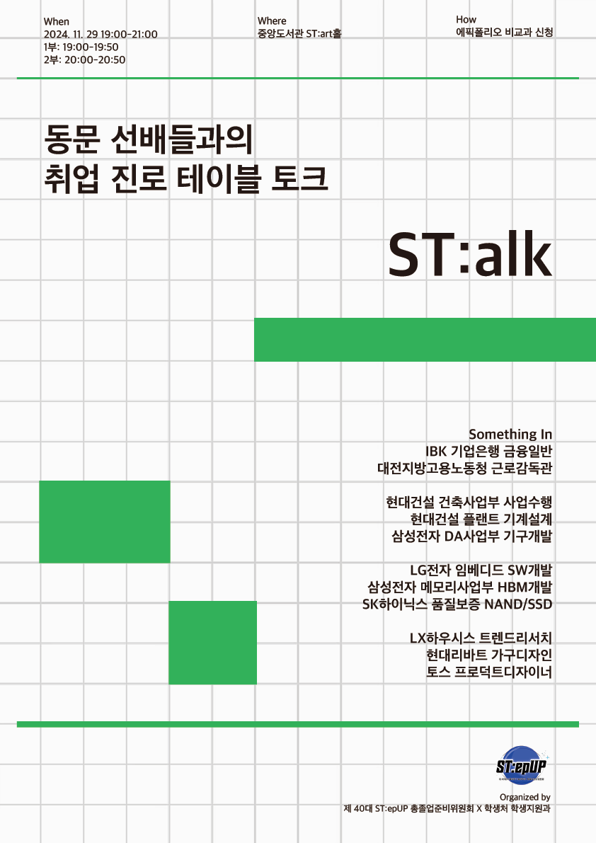STalk는 제40대 총졸업준비위원회 ST:epUP에서 주최한 행사로, 재학생들이 관심 있는 직무나 직업에 대해 선배님들과 편하게 대화할 수 있는 기회를 제공합니다. 이 행사는 단순한 강연이 아니라, 선배님들과의 질의응답을 통해 다양한 직군에 대한 생생한 경험담을 들을 수 있는 색다른 형태의 취업 강연이라고 해요! 참여 학생들은 동일한 학과의 선배님들의 조언을 직접 듣고, 질문하며 자신의 미래 방향을 찾는 데 도움을 받을 수 있습니다.
