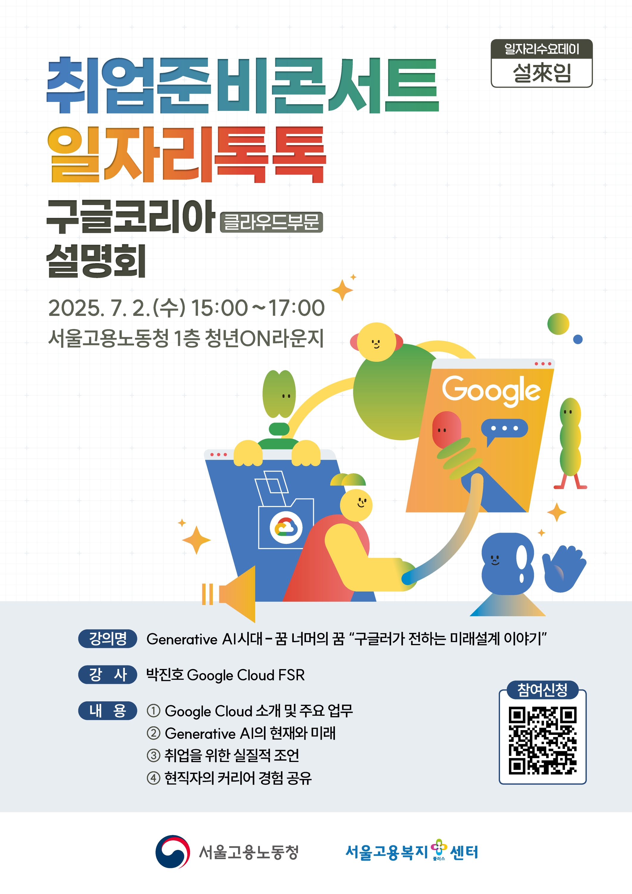 일시: 2025. 7. 2.(수) 15:00~17:00장소: 서울고용노동청(서울고용복지+센터) 1층 청년ON라운지내용:- 기Google Cloud 소개 및 주요 업무- Generative AI의 현재와 미래- 취업을 위한 실질적 조언- 현직자의 커리어 경험 공유※ 포스터 하단의 QR코드를 통한 '사전신청' 필수!