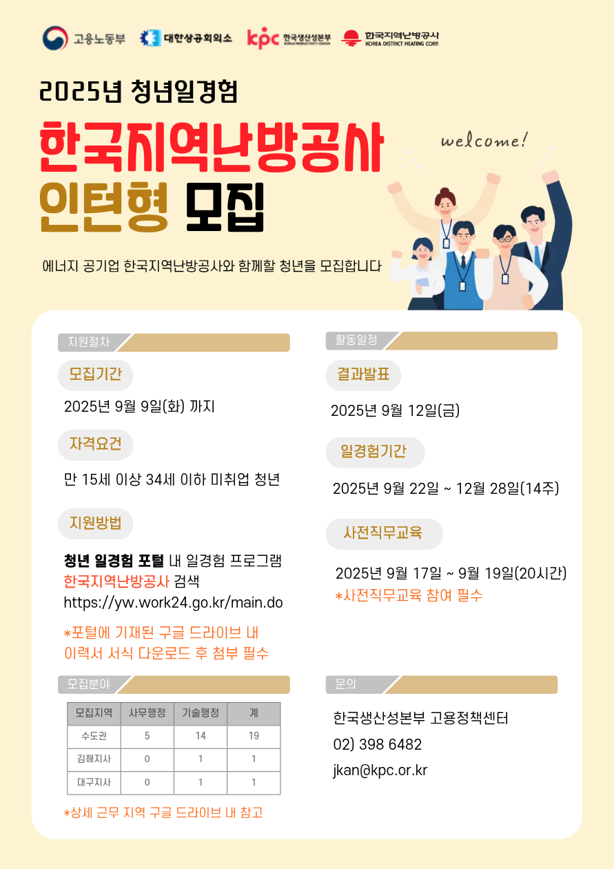 | 제목 | [고용노동부] 청년 일경험 한국지역난방공사 인턴 프로그램 | 마감일시 | 2025-09-09 | 조회수 | 117 |