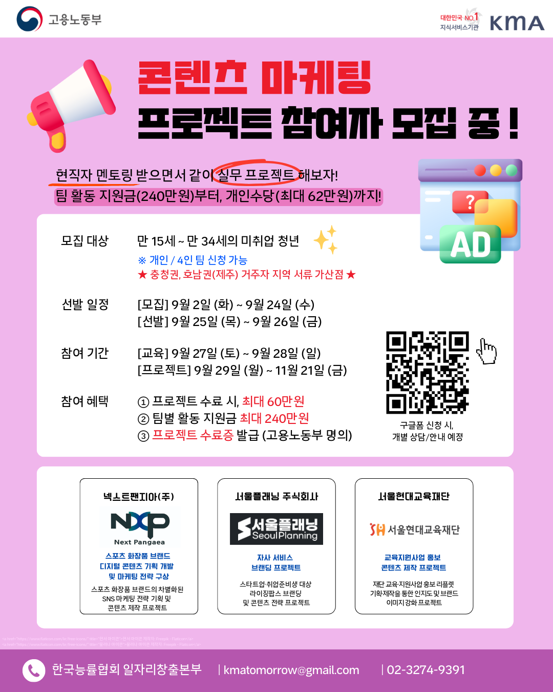 [고용노동부] 한국능률협회 청년일경험 프로젝트 - 콘텐츠 마케팅1 프로젝트 참여자 모집