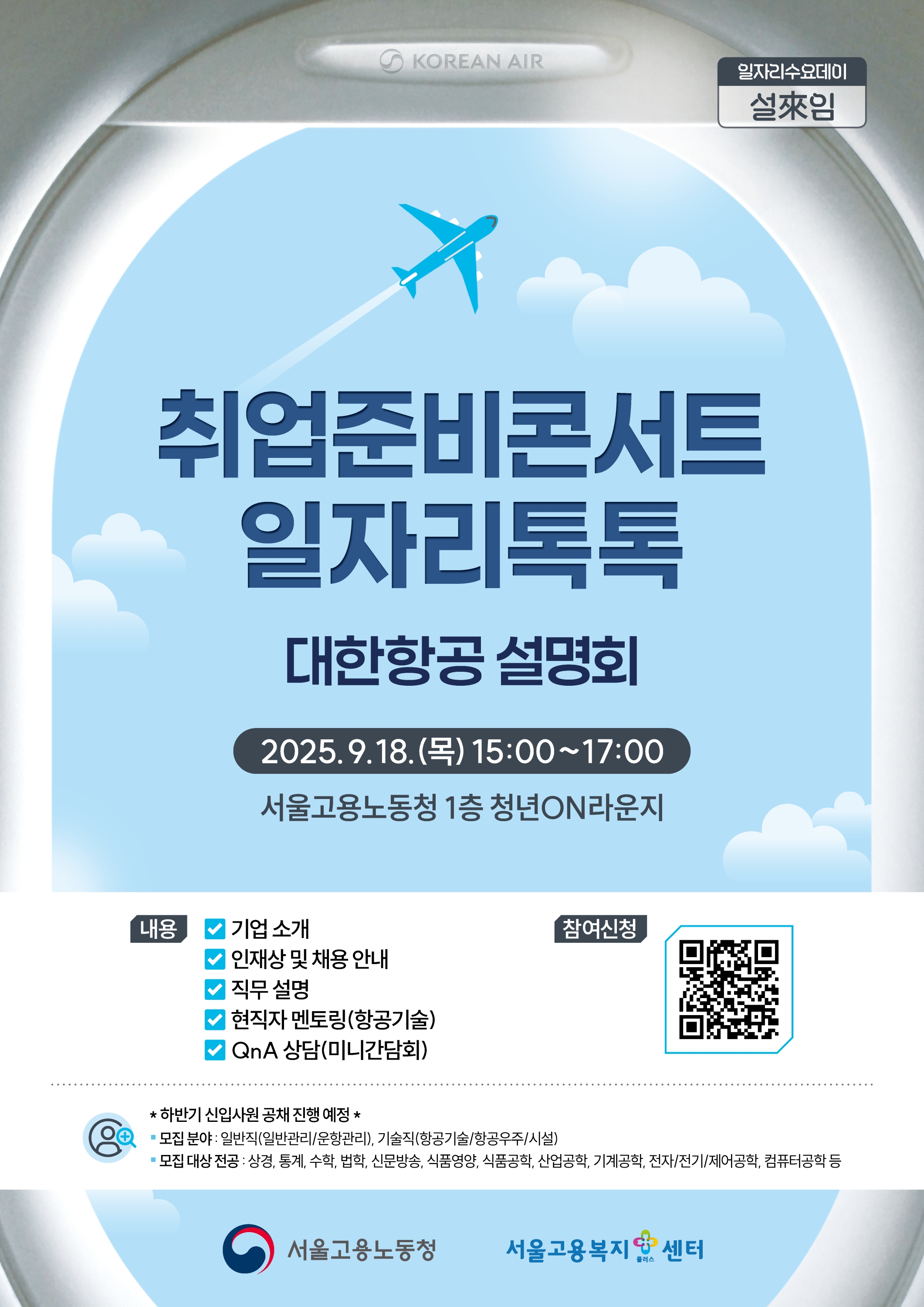 일시: 2025. 9. 18.(목) 15:00~17:00장소: 서울고용노동청(서울고용복지+센터) 1층 청년ON라운지※ 포스터 하단의 QR코드를 통한 '사전신청' 필수!
