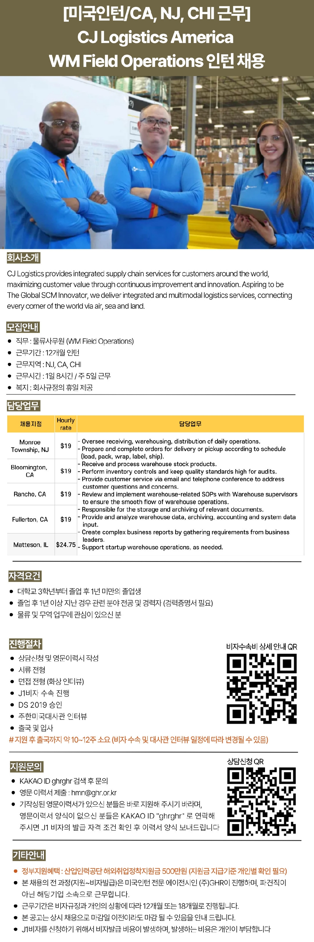 ▶Email 문의 및 지원 : 영문이력서가 있으신 분들은 hmn@ghr.or.kr로 회신해 주시면 되며, 없으신 분들은 상담 신청 후 수령하셔도 됩니다 ▶상담신청 : https://forms.gle/QSdD64YRS8kRqyri7 ▶카카오톡 ID : ghrghr 검색 후 문의 ▶상담안내 : 이력서 작성하시기 전 자격요건 확인을 위해 상담신청 먼저 진행해 주셔도 됩니다.