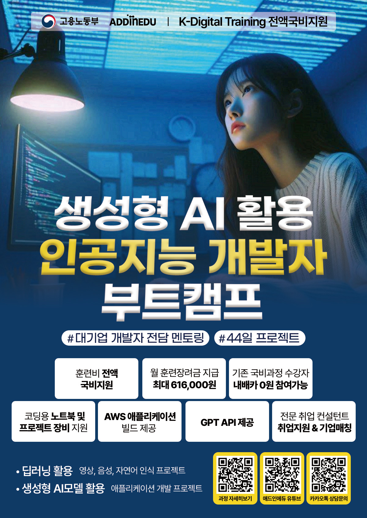 ■ 대상자 (우대사항) - 포트폴리오 개발(디벨롭)이 필요한 취업 준비생 - AI 및 첨단 기술 분야 진출을 희망하는 청년 구직자