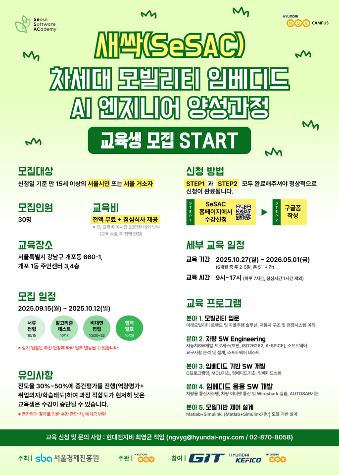 - 교육 기간 : 2025.10.27(월) ~ 2026.05.01(금) (6개월 중 주 2-5일, 총 511시간)