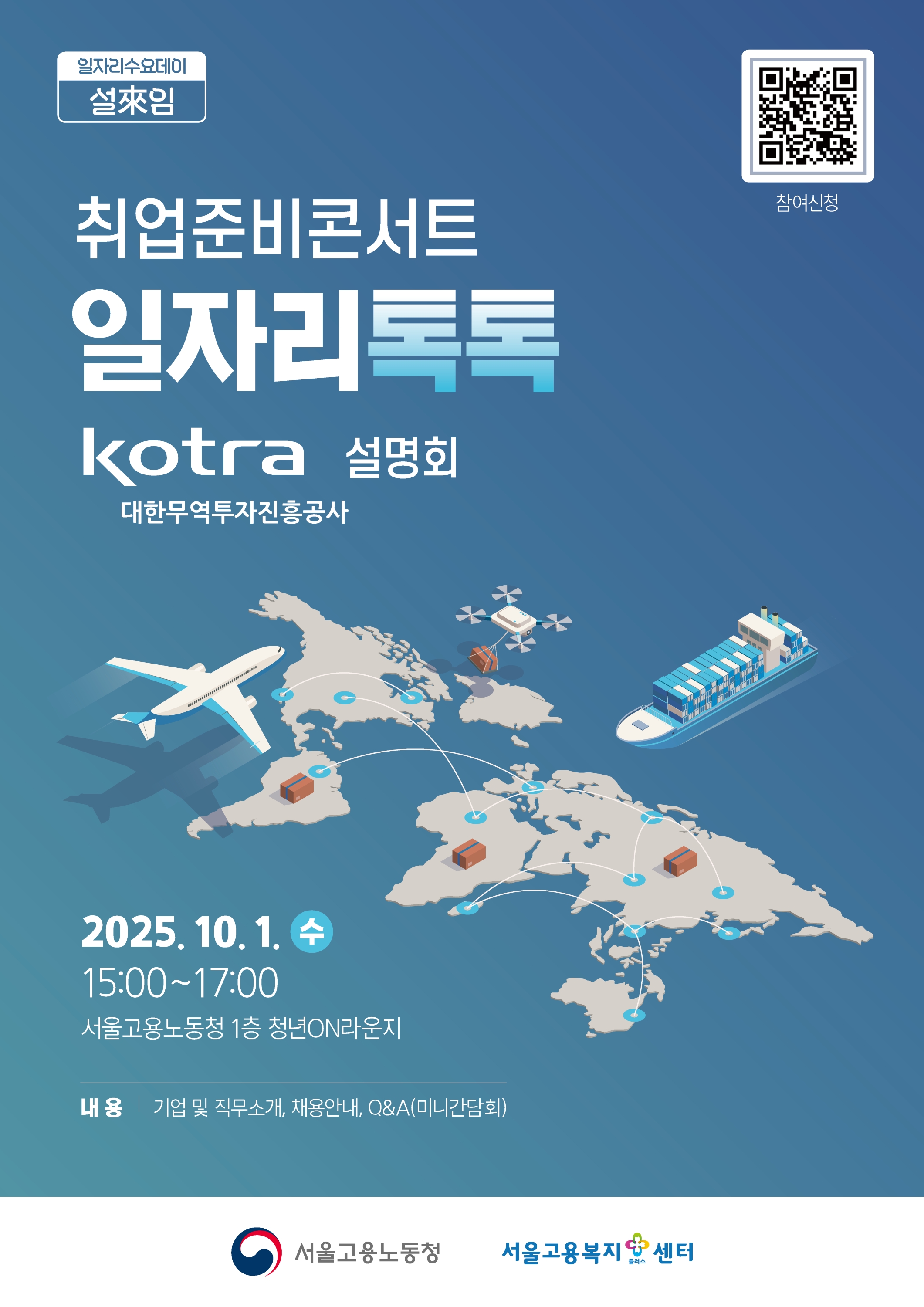 일시: 2025. 10. 01.(수) 15:00~17:00장소: 서울고용노동청(서울고용복지+센터) 1층 청년ON라운지※ 포스터 하단의 QR코드를 통한 '사전신청' 필수!