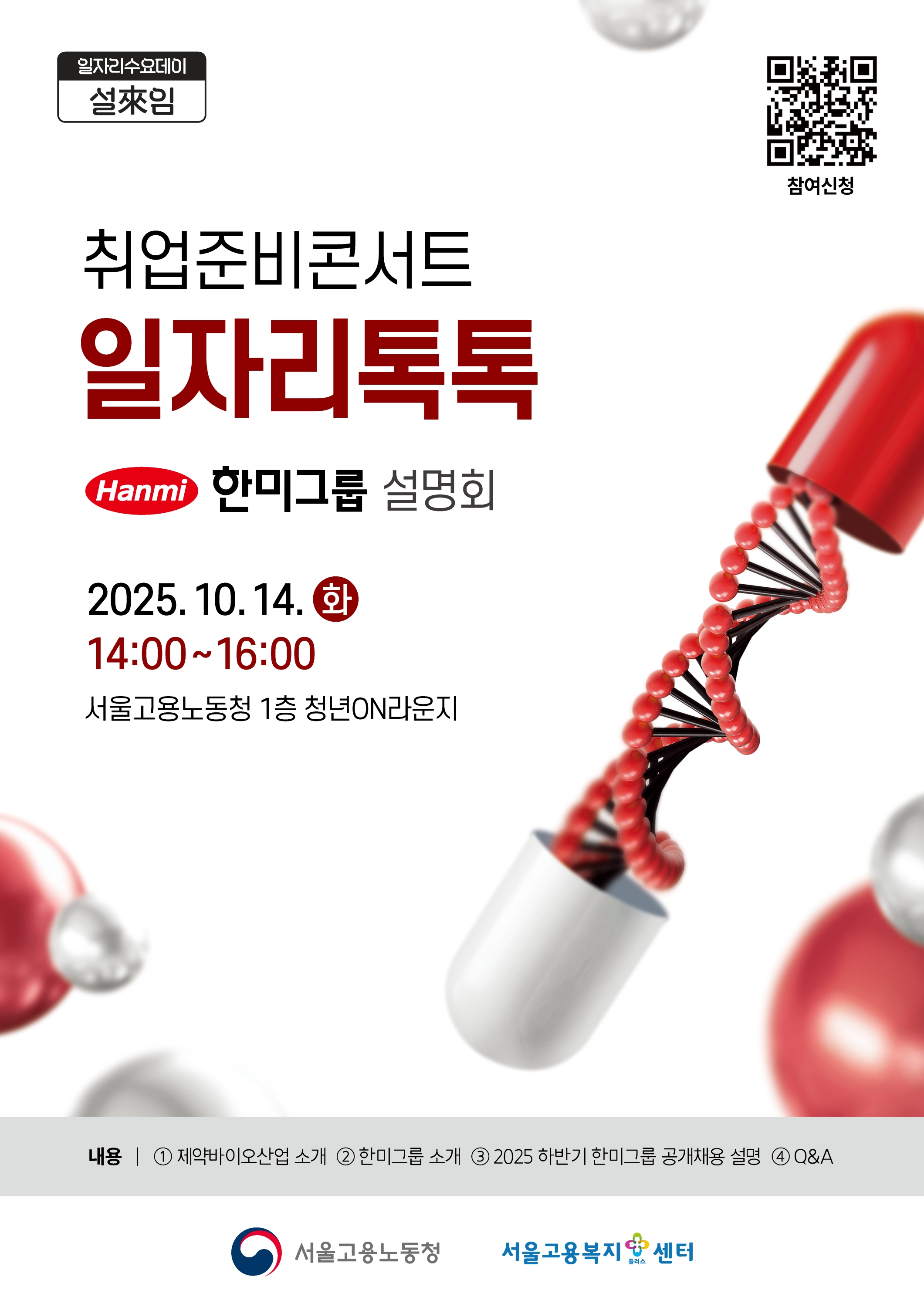 일시: 2025. 10. 14.(화) 14:00~16:00장소: 서울고용노동청(서울고용복지+센터) 1층 청년ON라운지※ 포스터 하단의 QR코드를 통한 '사전신청' 필수!
