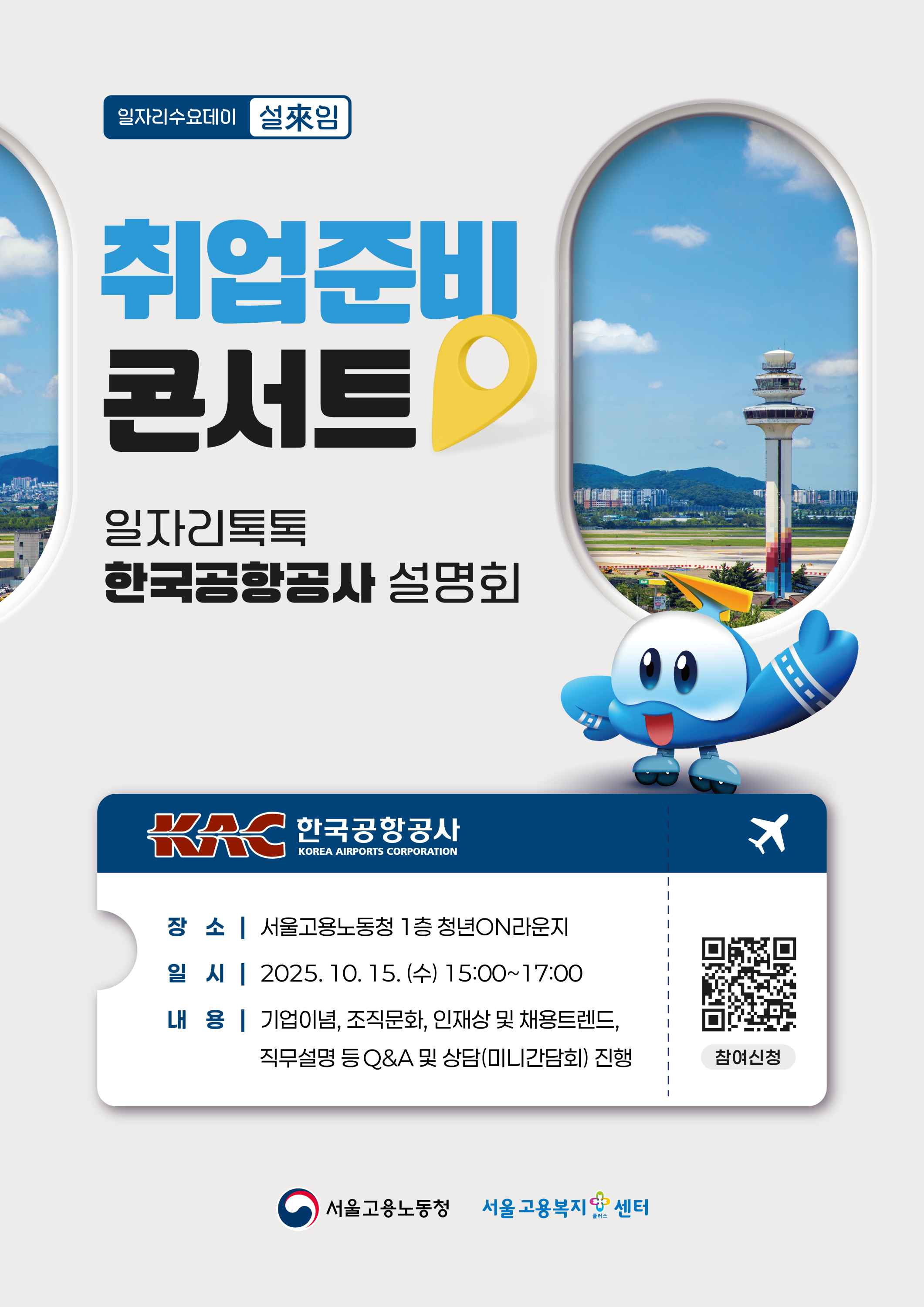 일시: 2025. 10. 15.(수) 15:00~17:00장소: 서울고용노동청(서울고용복지+센터) 1층 청년ON라운지※ 포스터 하단의 QR코드를 통한 '사전신청' 필수!