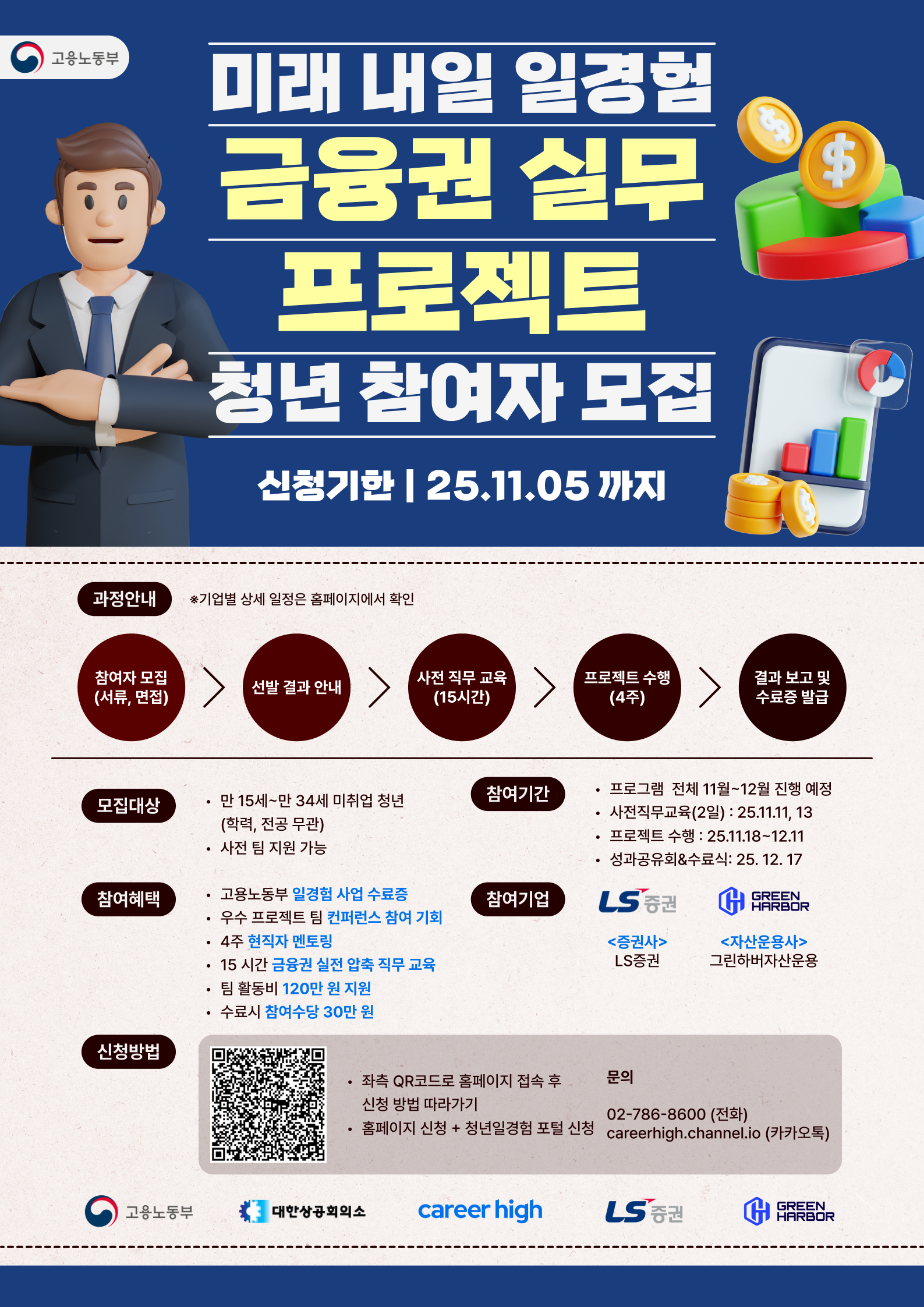 4. 프로젝트형 인턴쉽 - 개요: 금융권 실무 프로젝트 진행. 4인 1팀으로 구성, 기업과제 프로젝트 수행. - 프로그램 내용 > 클릭(상세 일정 바로가기) - 일시: 25. 11. 18(화) - 25. 12. 11(목), 프로그램 별 상이, 상세 일정 확인 - 장소: 영등포구 여의대방로 376 나라키움빌딩 3층 커리어하이