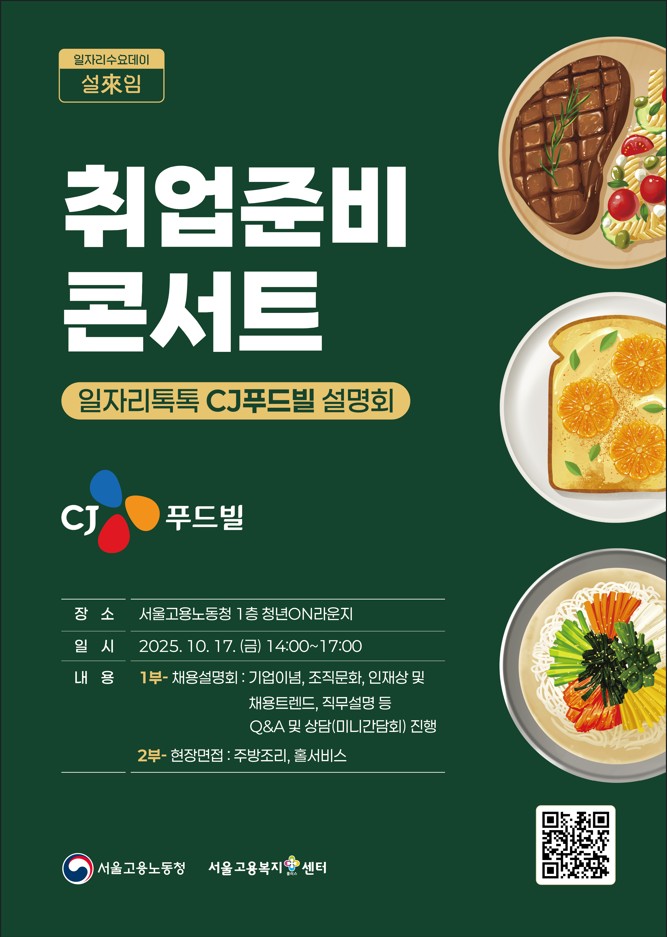 일시: 2025. 10. 17.(금) 14:00~17:00장소: 서울고용노동청(서울고용복지+센터) 1층 청년ON라운지※ 포스터 하단의 QR코드를 통한 '사전신청' 필수!