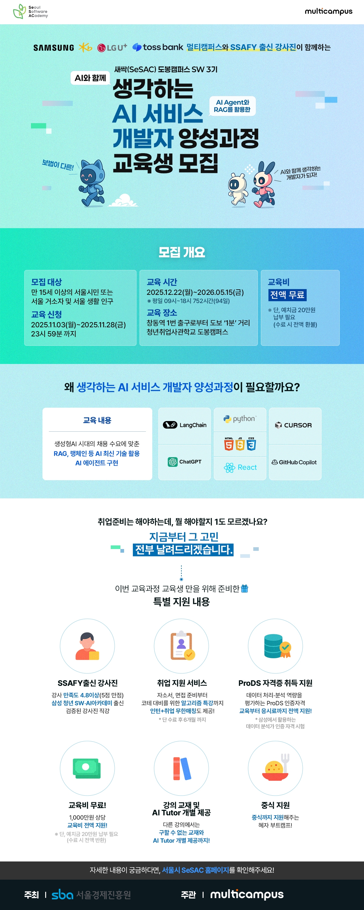 1. 과정 명: AI와 함께 생각하는 AI 서비스 개발자 양성과정 2. 교육생 모집일정: 2025.11.03(월) ~ 11.28(금) 3. 교육 수강일정: 2025.12.22(월) ~ 2026.05.15(금) 4. 교육 수강장소: 창동역 1번 출구 도보 1분거리 "청년취업사관학교 도봉캠퍼스" 5. 수강혜택: 교육비 전액 무료, SSAFY출신 강사진 직강, 취업지원서비스 제공, ProDS 자격증 취득지원, 강의교재 및 AI Tutor 제공, 중식 지원