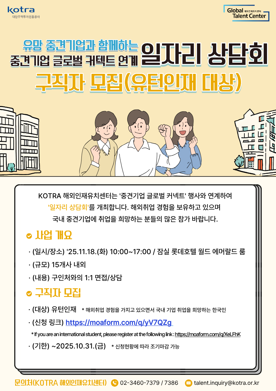 | 제목 | [해외취업] KOTRA '2025 중견기업 글로벌 커넥트 연계 해외인재 일자리 상담회' | 마감일시 | 2025-11-18 | 조회수 | 128 |
