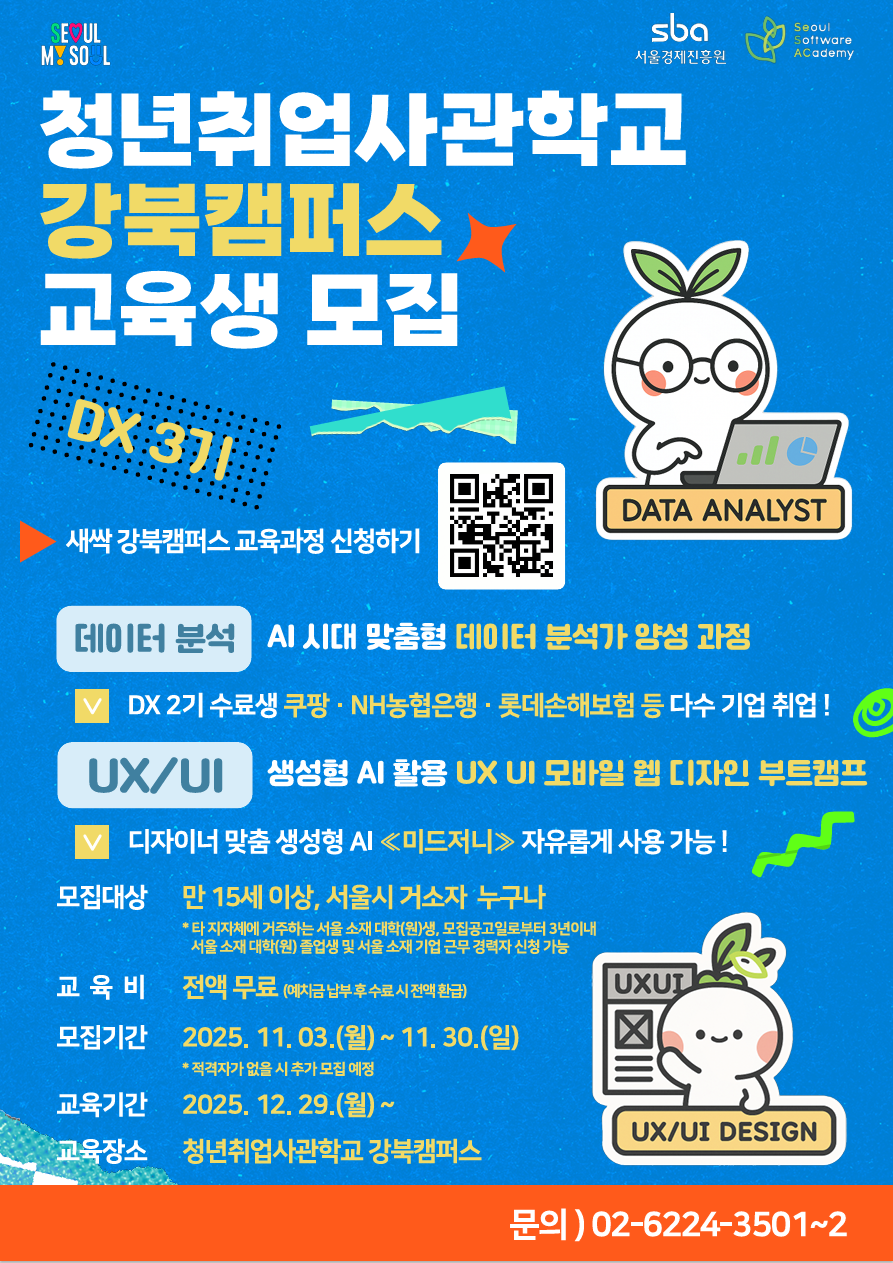 [서울시] 청년취업사관학교 새싹(SeSAC) 강북 캠퍼스 3기 교육생 모집 안내