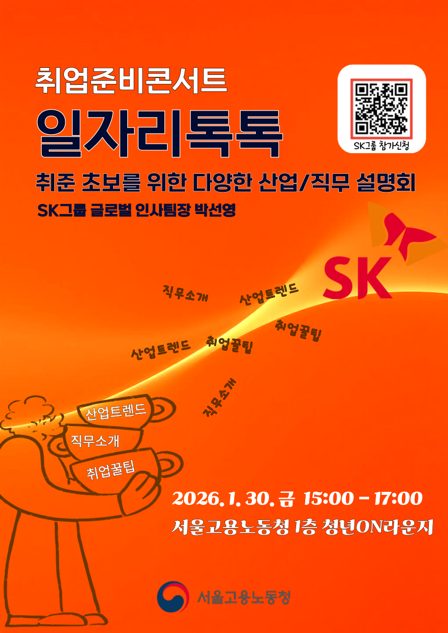 | 제목 | [고용노동부] 서울고용노동청과 함께하는 취업준비콘서트_일자리톡톡(SK그룹) | 마감일시 | 2026-01-29 | 조회수 | 83 |