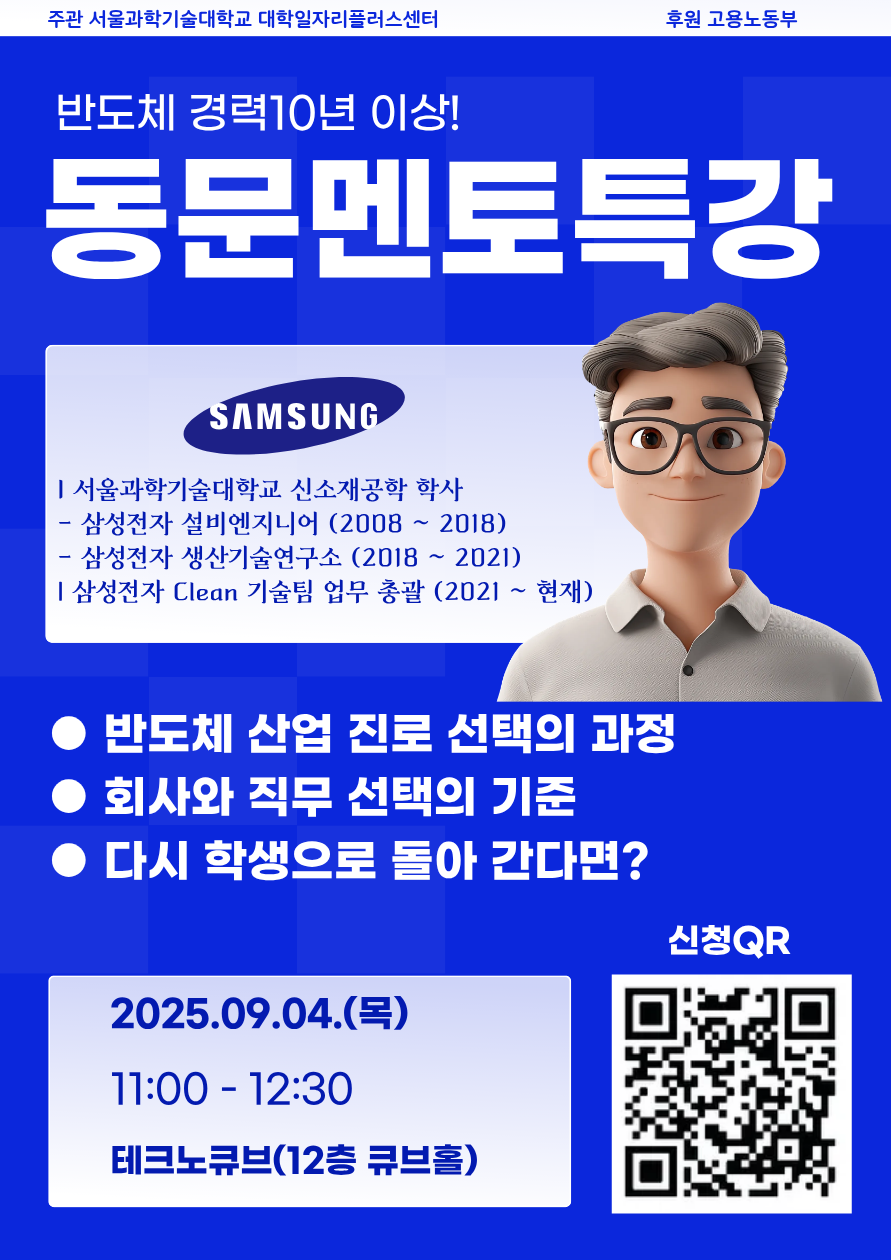 서울과학기술대학교 대학일자리플러스센터에서는 ST 커리어박람회의 일환으로 동문 선배를 초청하여 진로·취업 특강을 진행합니다. 관심 있는 학생들의 많은 참여 바랍니다.