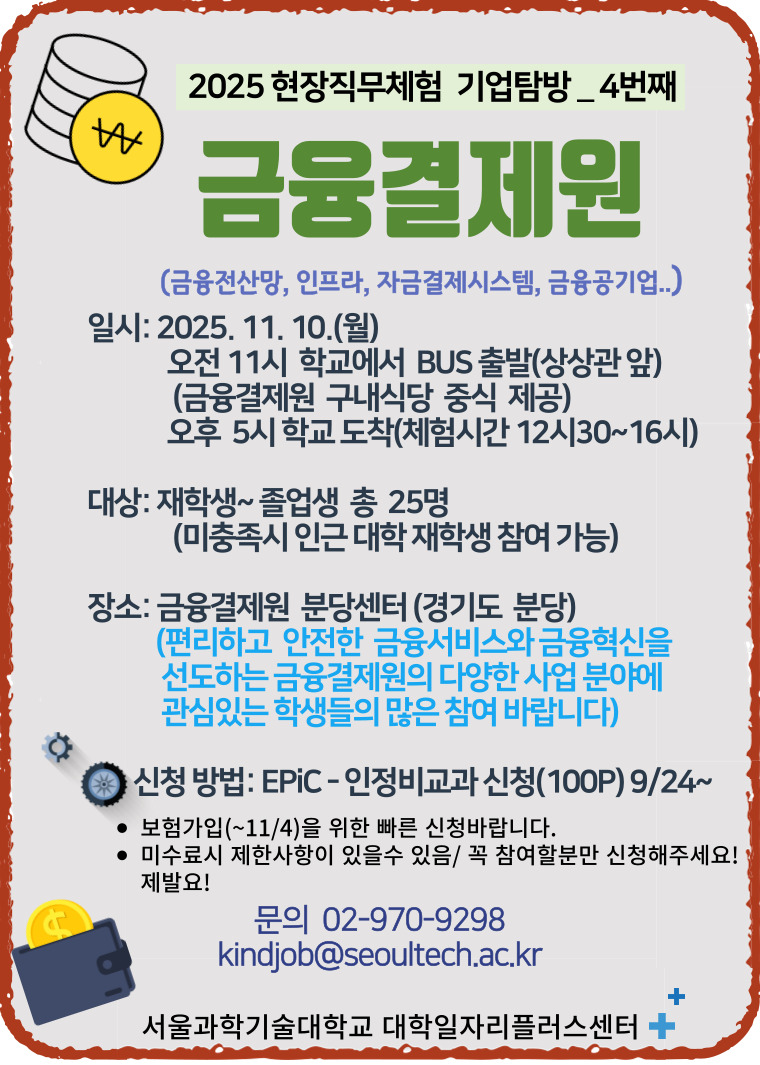 ★[모집]2025학년도 현장 직무체험 프로그램: 금융결제원 기업탐방(11/10)