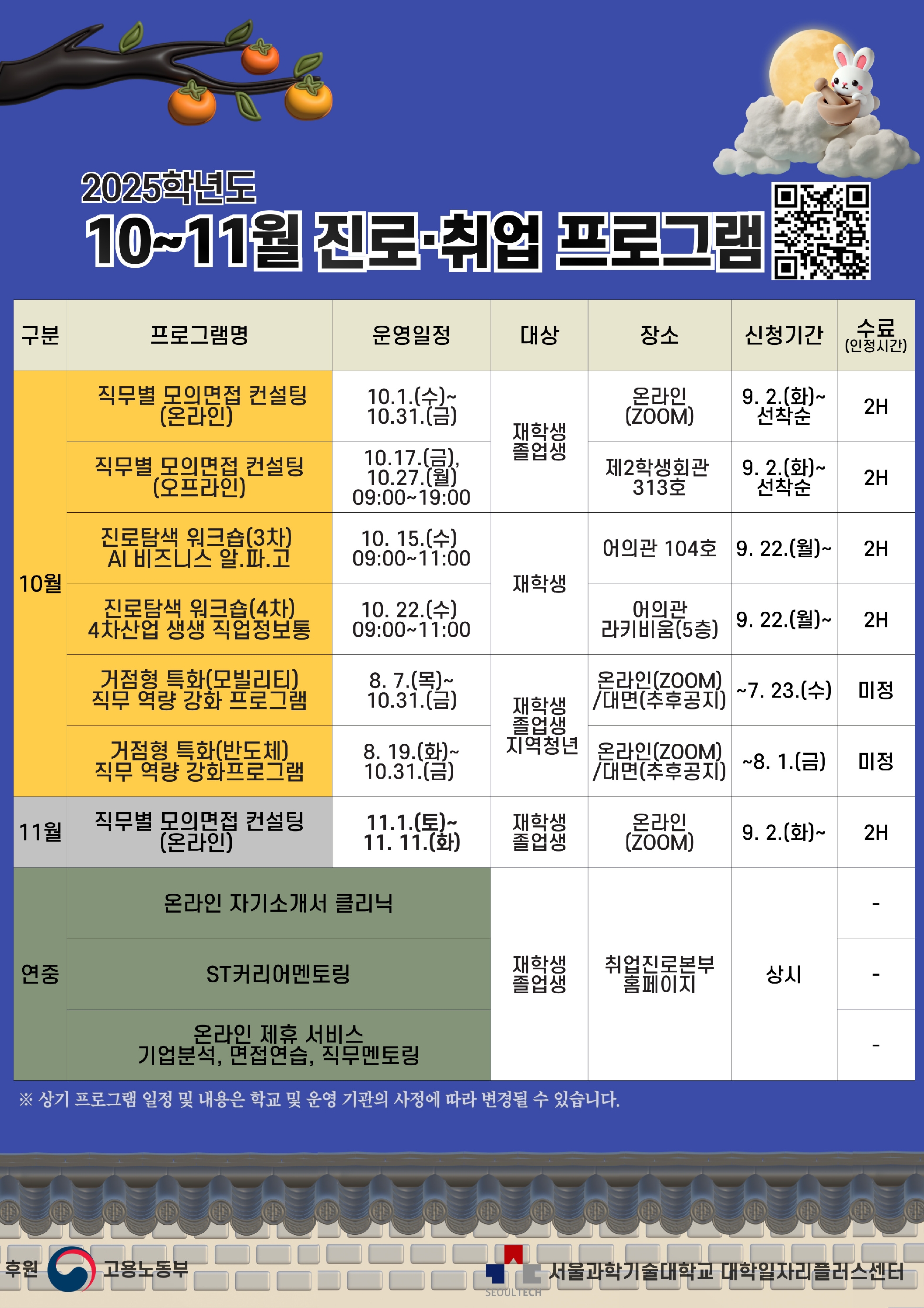 서울과학기술대학교 취업진로본부에서는 학생 여러분의 진로 탐색과 취업 역량 강화를 위한 2025년 10~11월 비교과 프로그램을 아래와 같이 운영합니다.