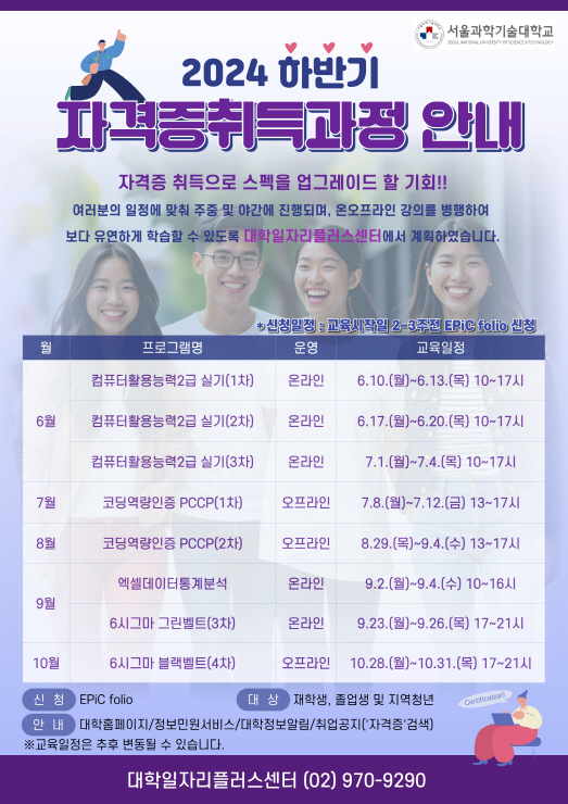 ★등록 방법 및 문의 1. 안내 : EPiC folio 또는 홈페이지/정보민원서비스/대학정보알림/취업공지: '자격증'검색 2. 신청 : 각 과정별 신청은 EPiC folio를 통해 가능합니다.(일정은 추후 변동될 수 있음을 알려드립니다.) 3. 문의 : 02-970-9290(대학일자리플러스센터) |