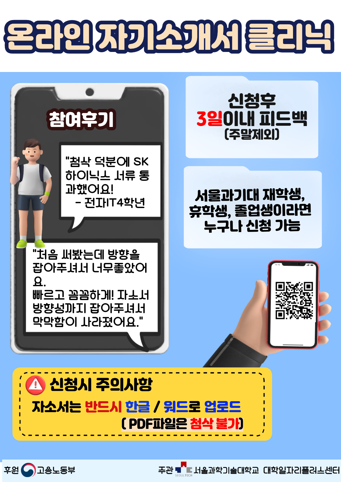 서울과학기술대학교 대학일자리플러스센터에서는 재학생 및 졸업생의 서류 합격률 향상을 위해 온라인 자기소개서 클리닉을 운영합니다.