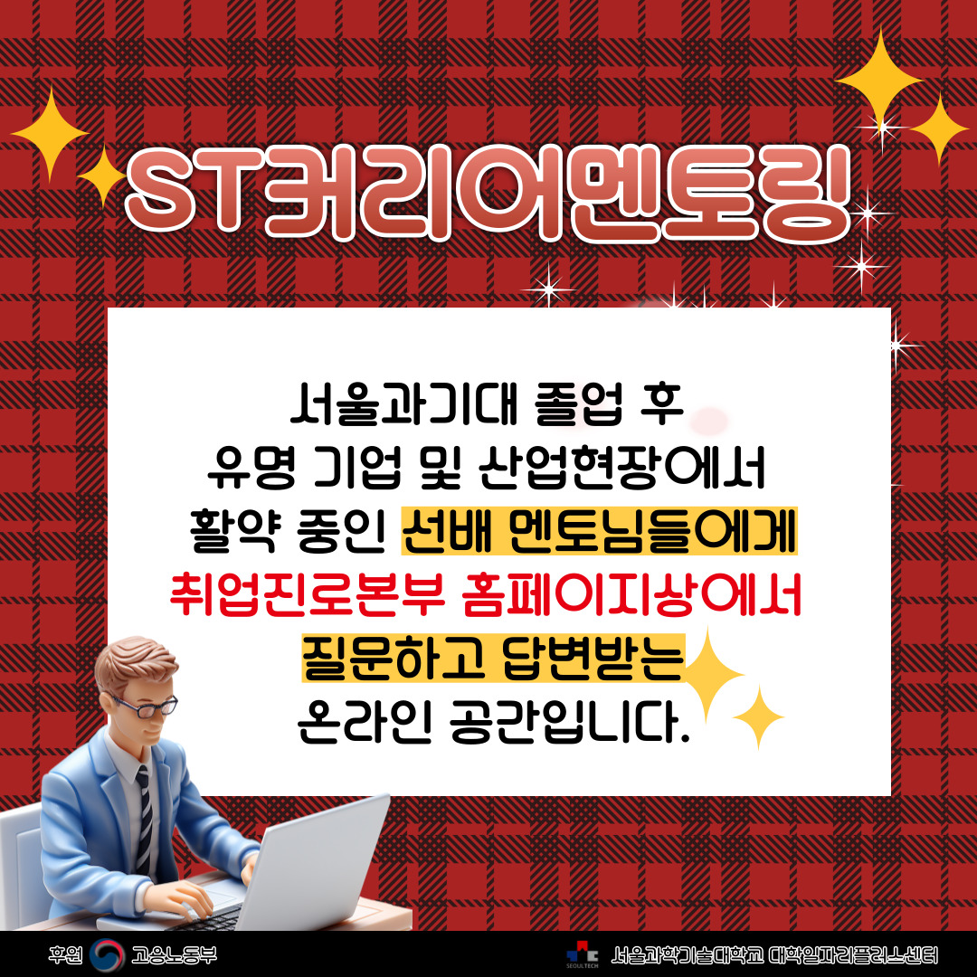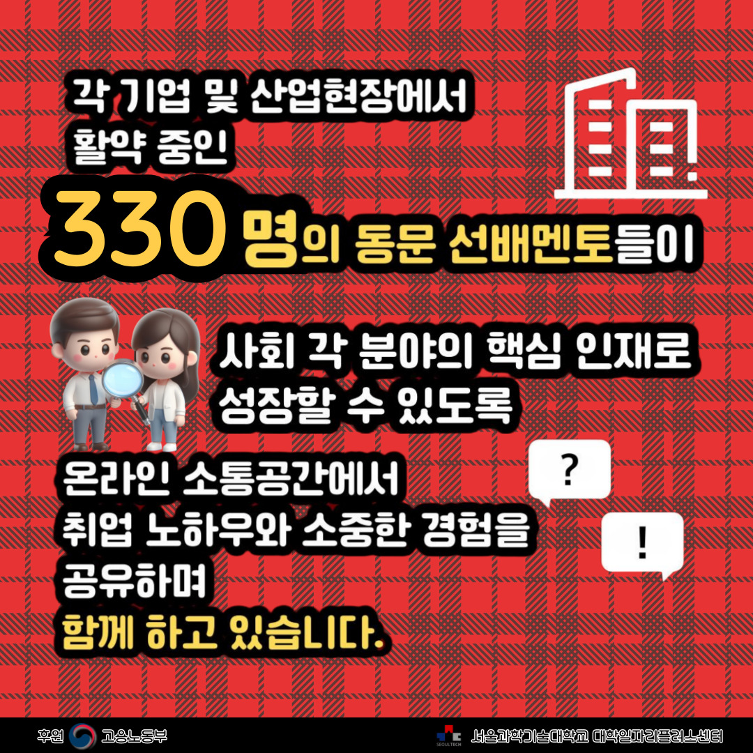 각 기업 및 산업현장에서 활약중인 330명의 동문 선배멘토들이 온라인 소통공간, [ST커리어멘토링]에서 취업노하우와 소중한 경험을 공유하며 함께 하고 있습니다.