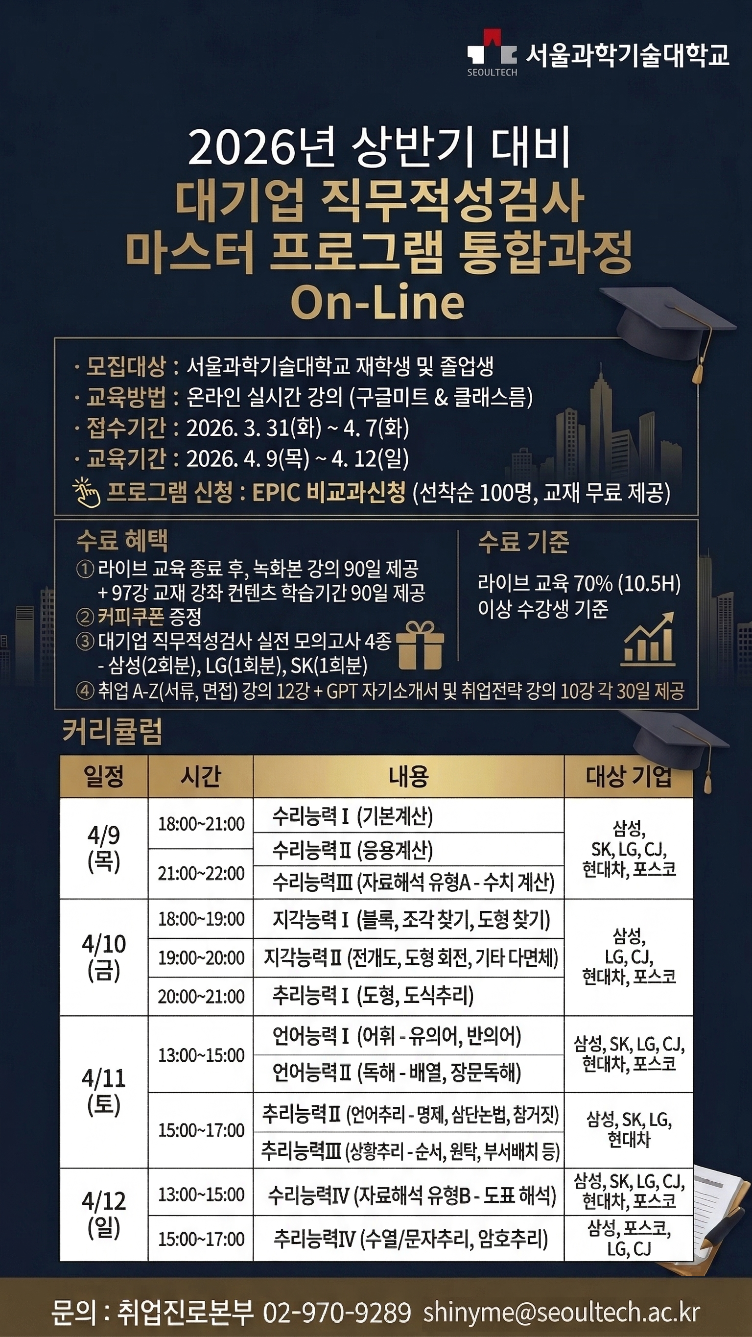 * 문의: 취업진로본부 02-970-9289 ㅣ shinyme@seoultech.ac.kr