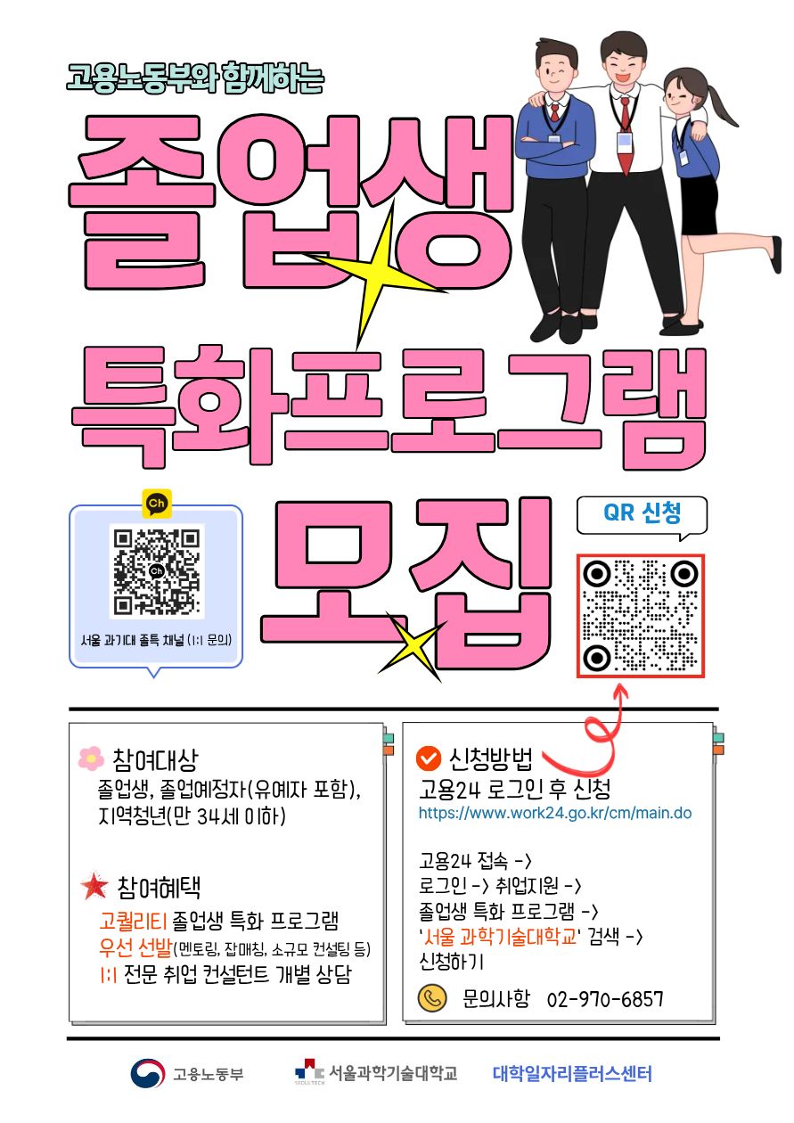 서울과학기술대학교 취업진로본부에서는 공백기 고민을 끝내고 커리어를 다시 시작할 졸업생 여러분을 위해 고용노동부 선정 '2026 졸업생 특화 프로그램'을 운영합니다. 단순한 교육을 넘어, 대학이 직접 보증하고 기업에 매칭하는 차세대 취업 에이전시를 지금 경험하십시오.