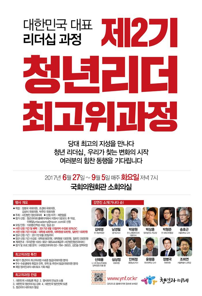 제2기 청년리더 최고위과정은 2017년 6월 27일부터 9월 12일, 매주 화요일 저녁 7시부터 국회의원회관 소회의실에서 개최됩니다.